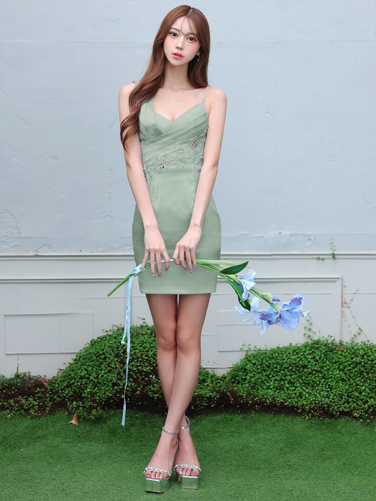胸元のクロスドレープデザインが、立体感と上品な華やかさを演出する一着。