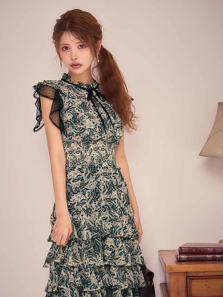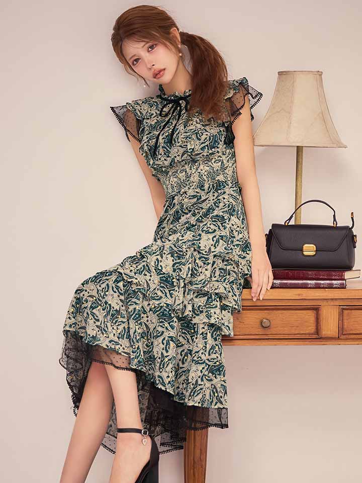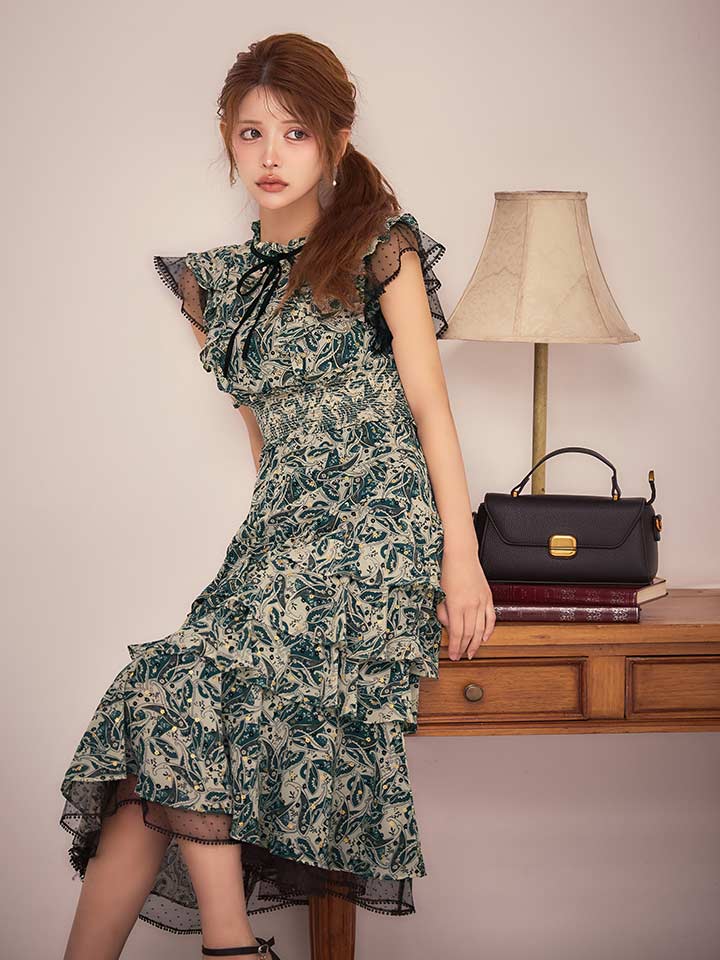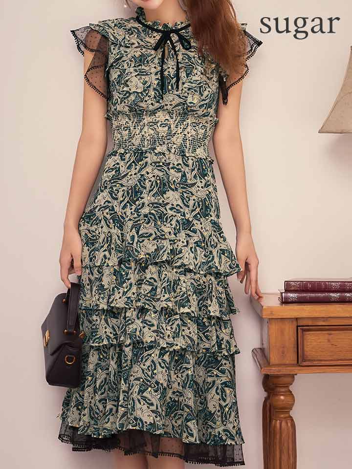 XS-Lサイズあり【SETTAN/セッタン】ペイズリー柄/ シフォン/ フリルスリーブ/ ティアード/ Aライン/ 膝丈/ ワンピース/ ミディアムドレス/ キャバドレス[OF2] [LKS111208-GR-S260127]