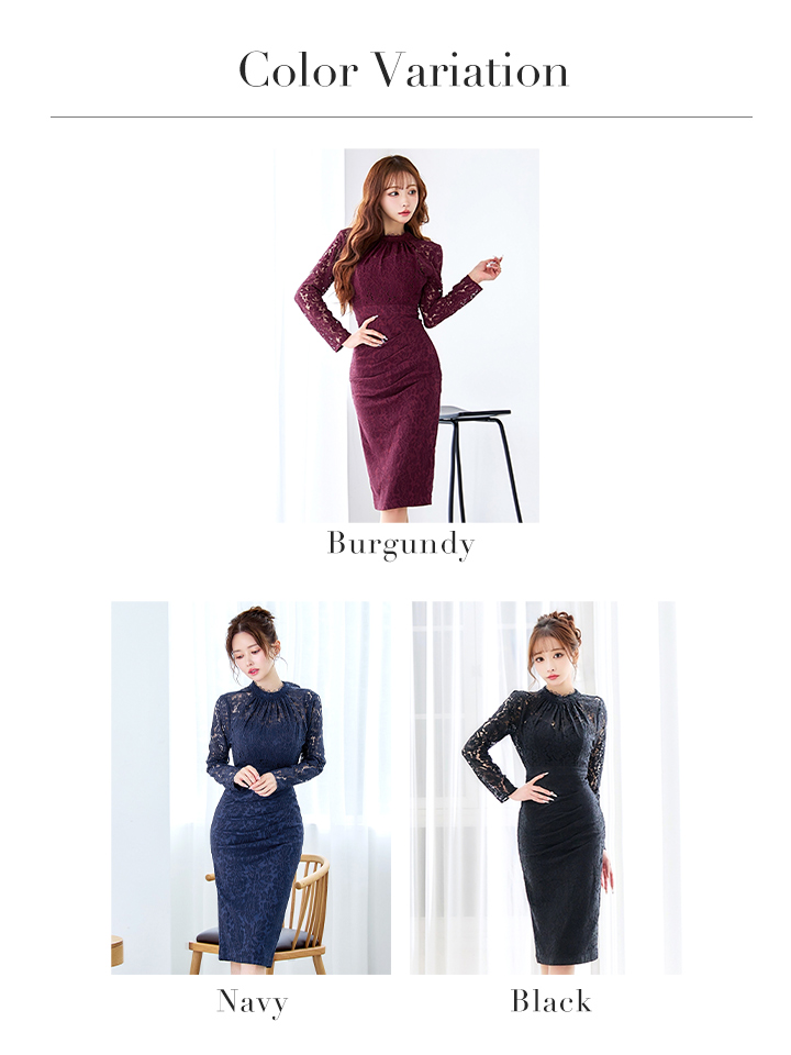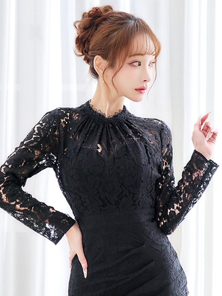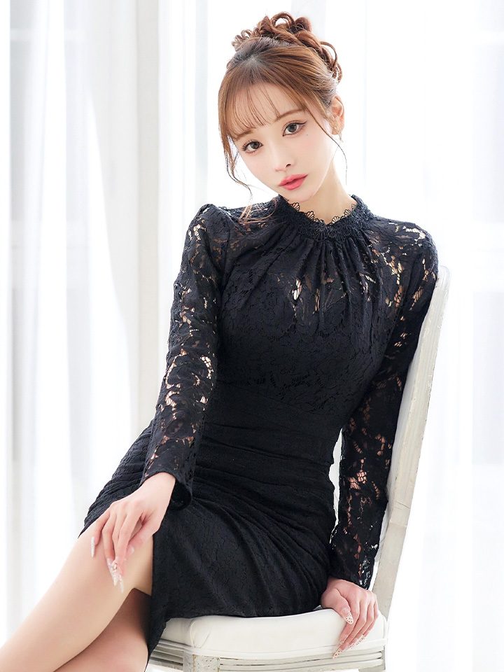 Lサイズあり【VANESSA HEART / ヴァネッサハート】【OF05】総レース/ ハイネック/ ロングスリーブ/ 袖あり/ タック/ 膝丈/ タイト/ ミディアムドレス/ キャバドレス [H60174H-B-S2601]