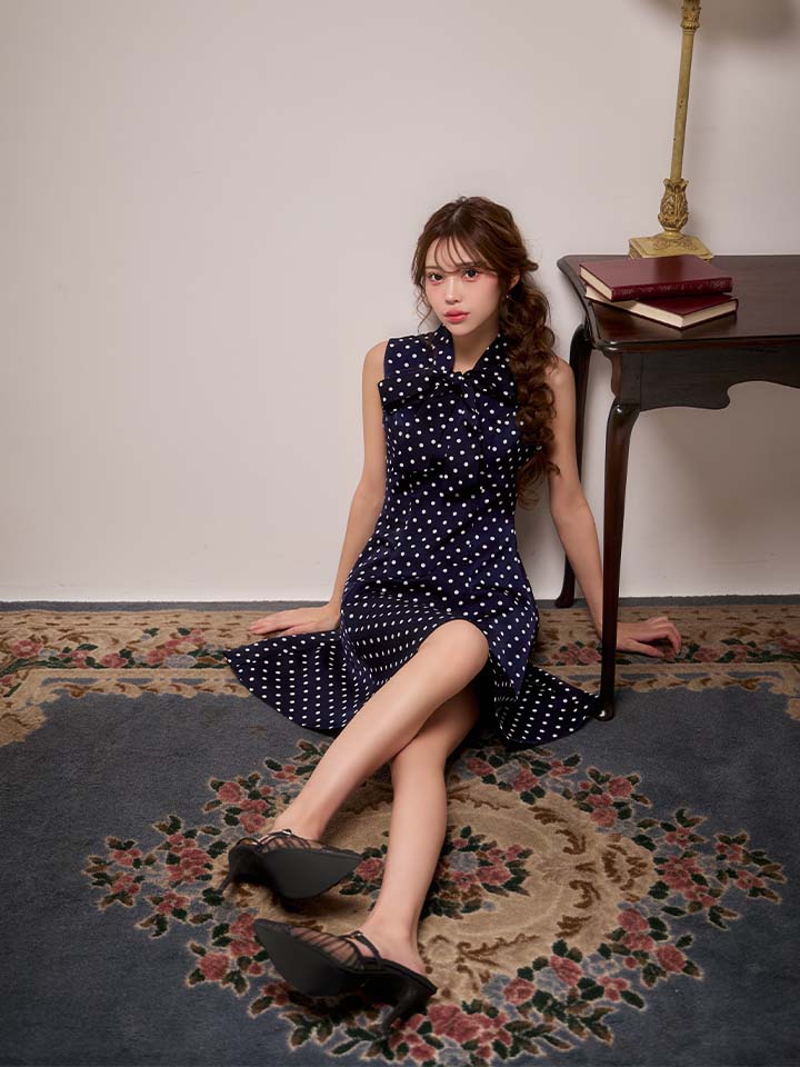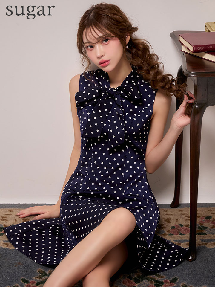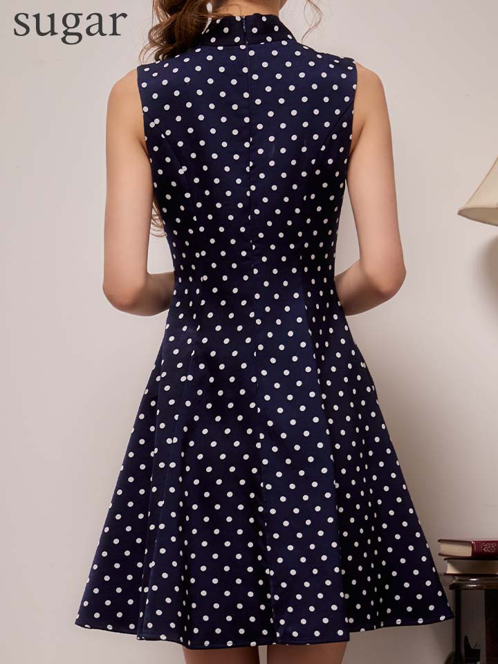 XS-Lサイズあり【ERUKEI エルケイ】ドット/ ノースリーブ/ プチハイネック/ リボン/ Aライン/ ワンピース/ ミニドレス/ キャバドレス[OF2] [LKE25038-NVxW-S260127]