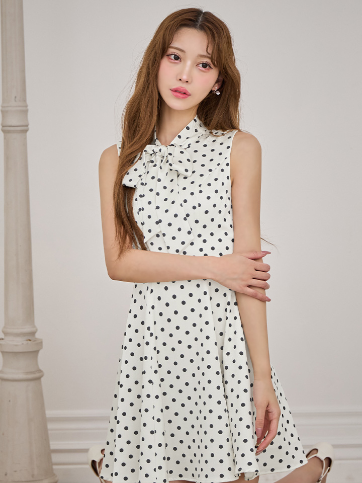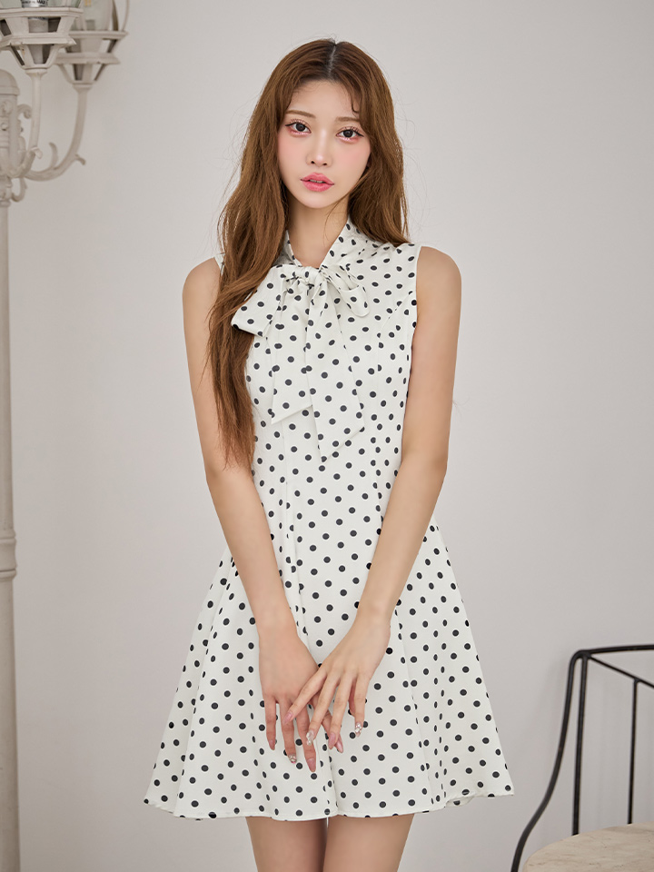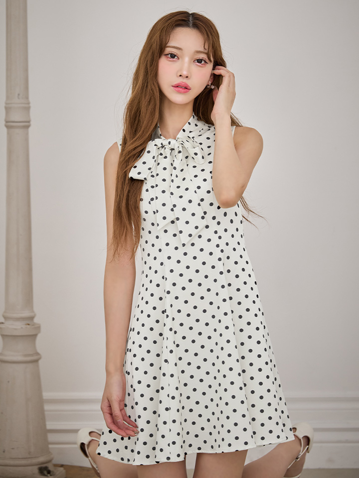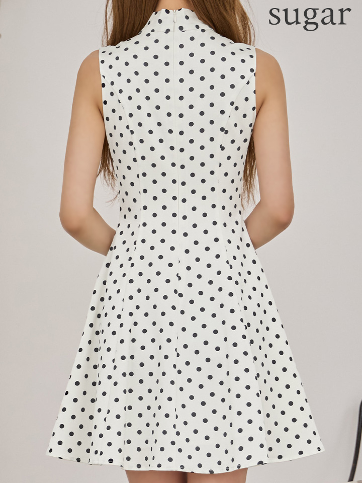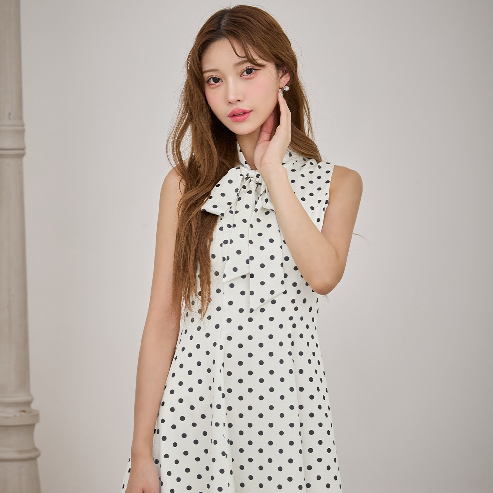 XS-Lサイズあり【ERUKEI エルケイ】ドット/ ノースリーブ/ プチハイネック/ リボン/ Aライン/ ワンピース/ ミニドレス/ キャバドレス[OF2] [LKE25038-IVxB-S260128]
