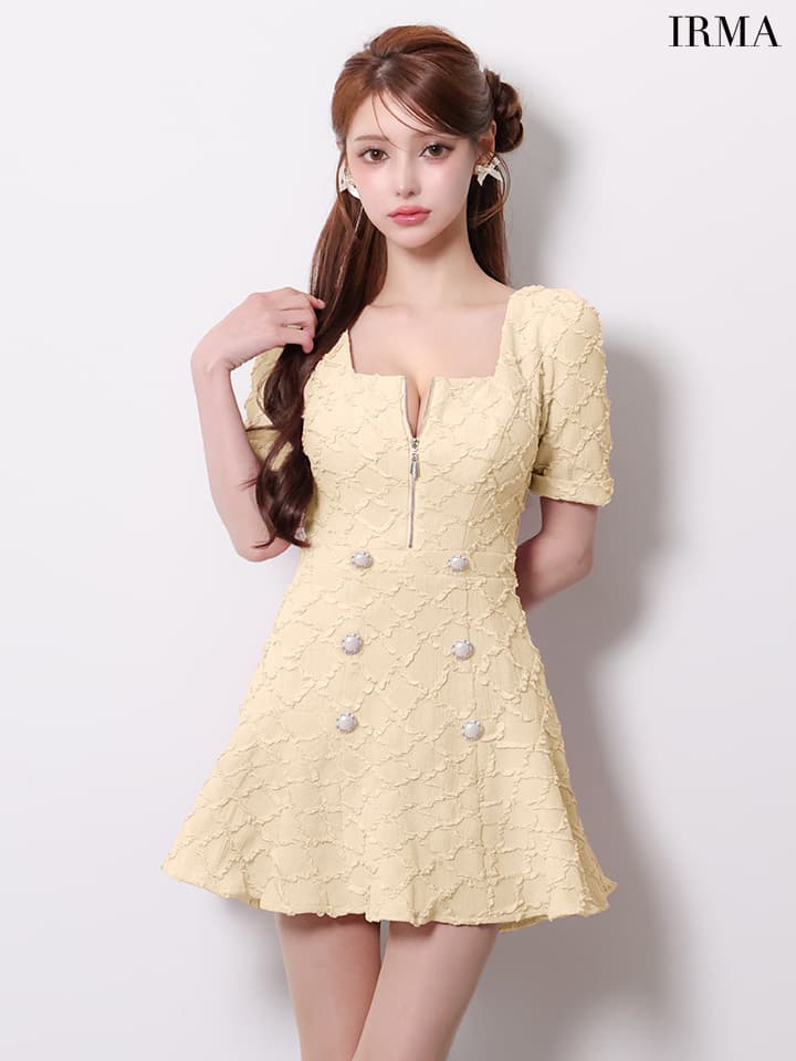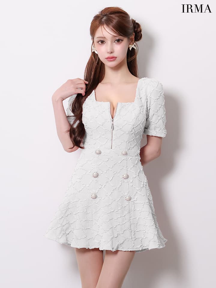 XSサイズあり【IRMA/イルマ】ダイヤ柄/ ジャガード/ 袖あり/ スクエアネック/ パールボタン/ 半袖/ ハイウエスト/ フレア/ ミニドレス/ キャバドレス[OF2A] [61018-IR-B-2601]