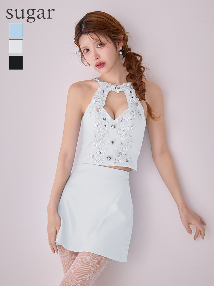 XSサイズあり【ANGEL R/エンジェルアール】ホルターネック/ ボタン/ フラワーレース/ ビジュー/ セパレート/ マイクロミニドレス/ キャバドレス[OF2] [AR25306-SAX-S260128]