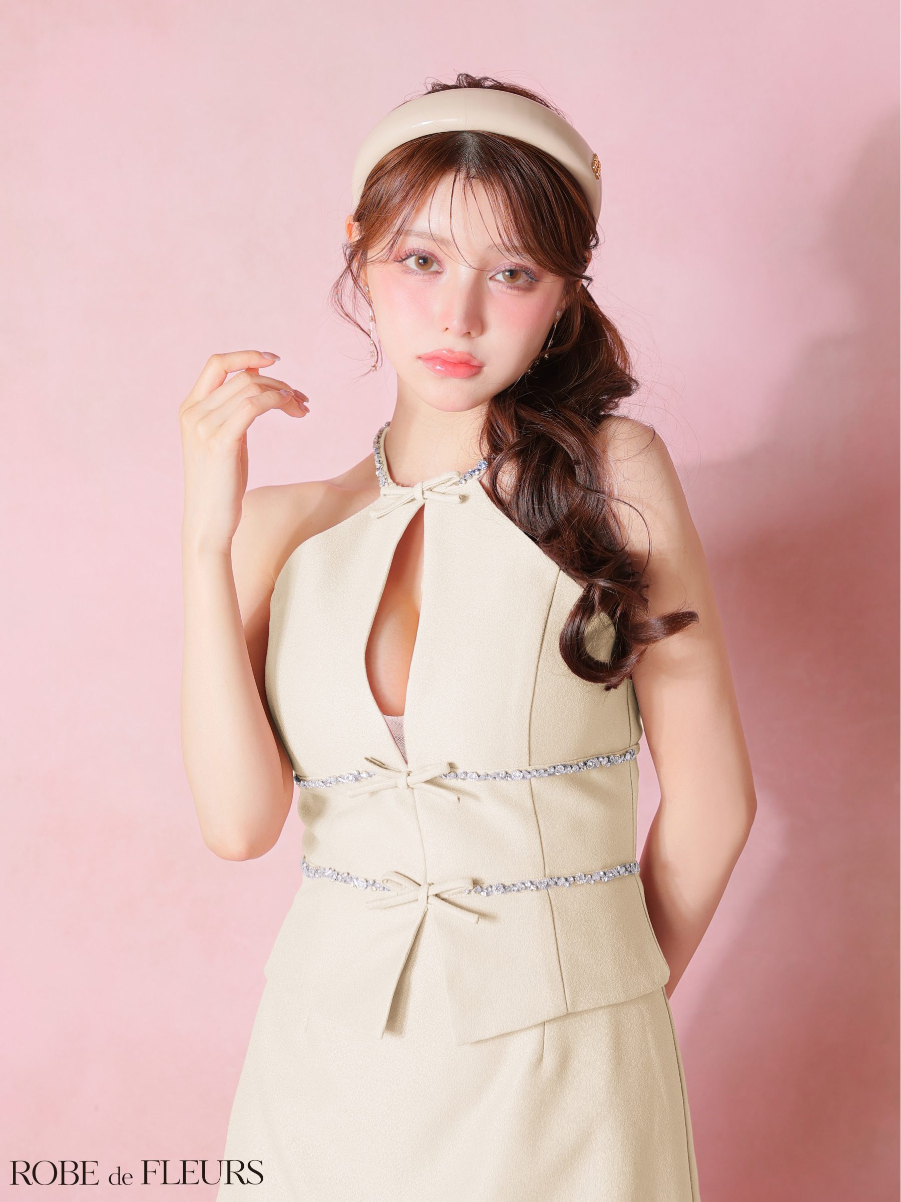 【予約商品/1月下旬発送予定】XSサイズあり【ROBE de FLEURS/ローブドフルール】ラメ/ ツイル/ ビジュー/ リボン/ ホルターネック/ セットアップ/ ミニドレス/ キャバドレス[OF08] [FM4343-P-2601]