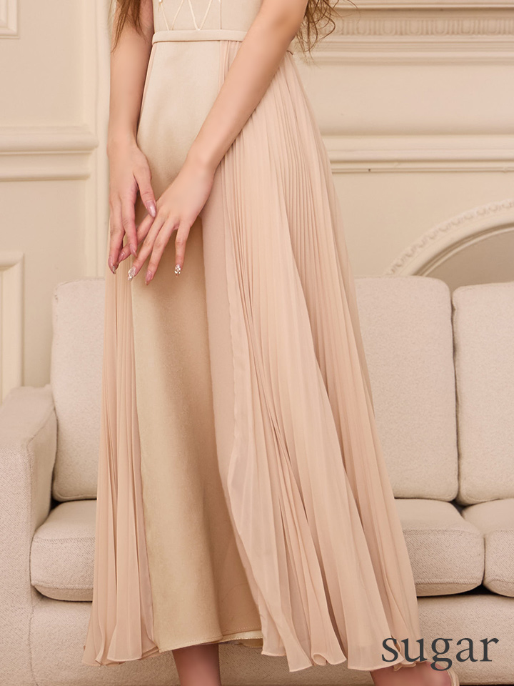 XSサイズあり【JEAN MACLEAN/ジャンマクレーン】サイドプリーツ/ キャミソール/ シフォン/ ハイウエスト切り替え/ ワンカラー/ Aライン/ フレア/ ワンピース/ ミディアムドレス/ キャバドレス[OF2A] [51994-JM-BE-S260131]