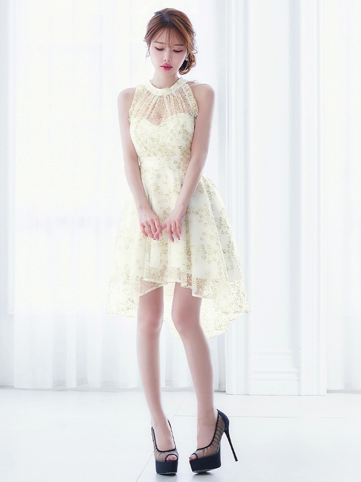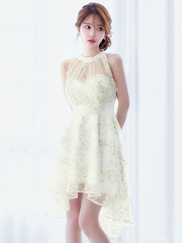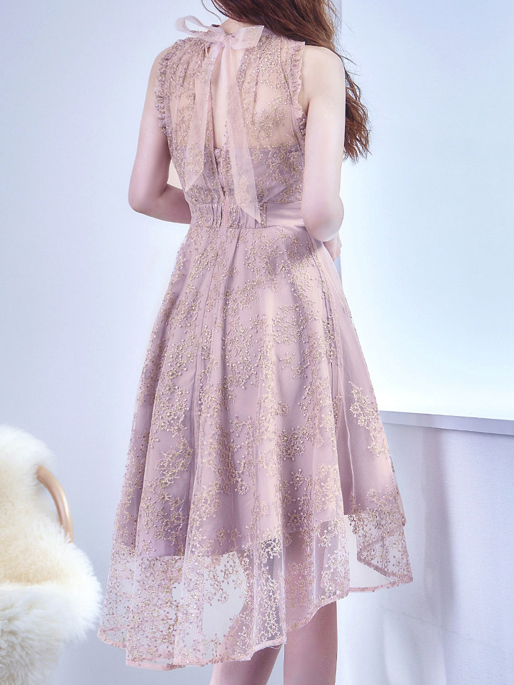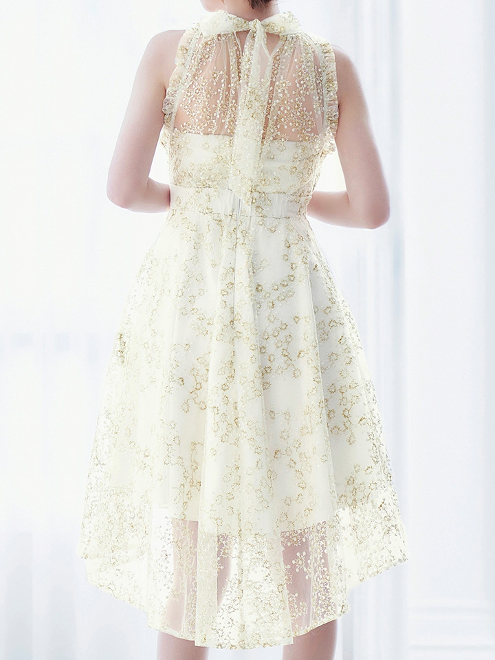 繊細な刺繍とシアーな透け感が女度を上げるフレアミニドレス。