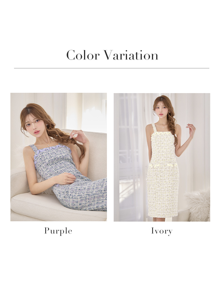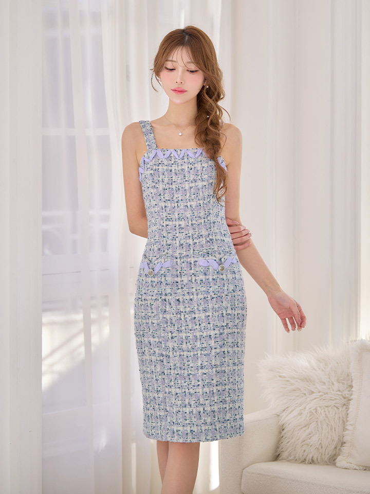 スパンコールが煌めくツイード素材が魅力のタイトミディアムドレス。