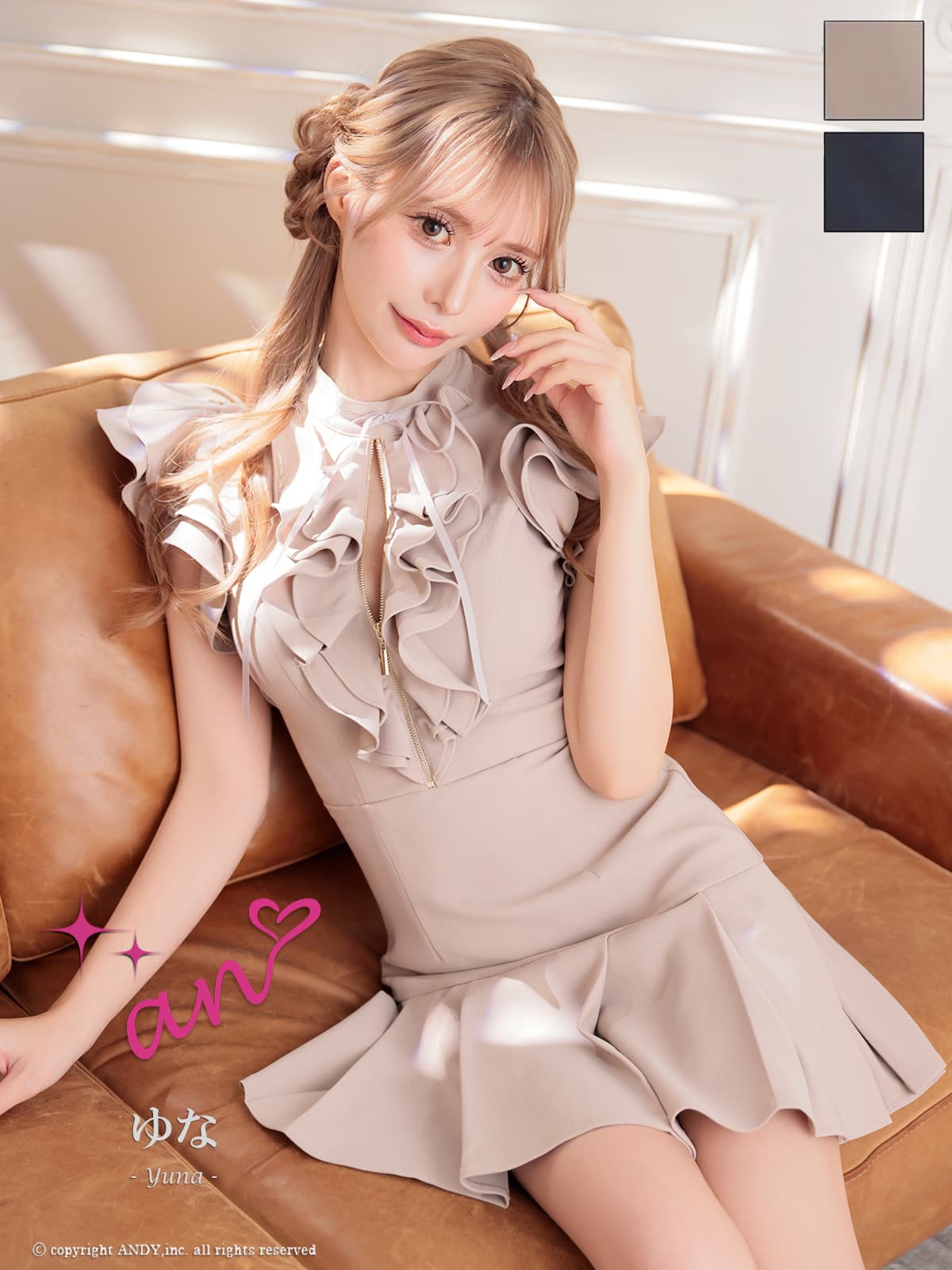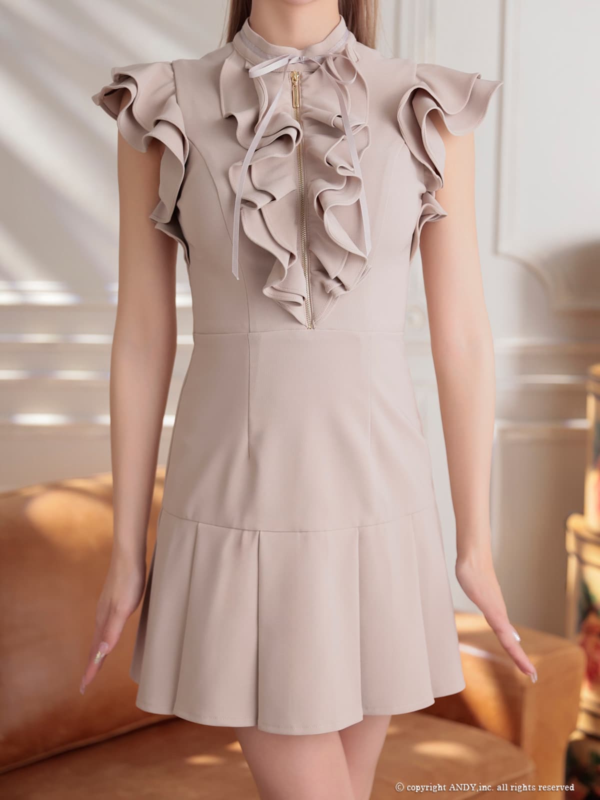 XSサイズあり【an /アン】ショルダーフリル/ プチハイネック/ バストジップ/ フレンチスリーブ/ プリーツ/ リボン/ ストレッチ/ フレア/ Aライン/ ミニドレス/ キャバドレス[OF05] [AOC4058-BE-2602]