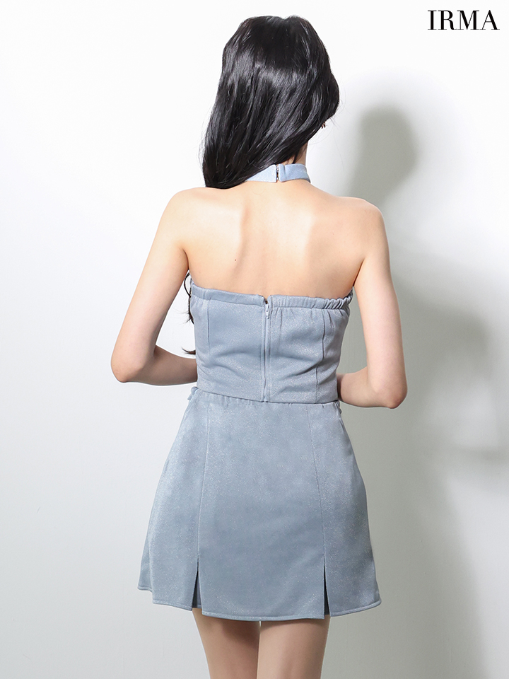 XSサイズあり【IRMA/イルマ】ラメニット/ ネクタイ風/ ホルターネック/ ノースリーブ/ ストレッチ/ フレア/ セットアップ/ ミニドレス/ キャバドレス[OF2A] [61014-IR-BLGY-2602]