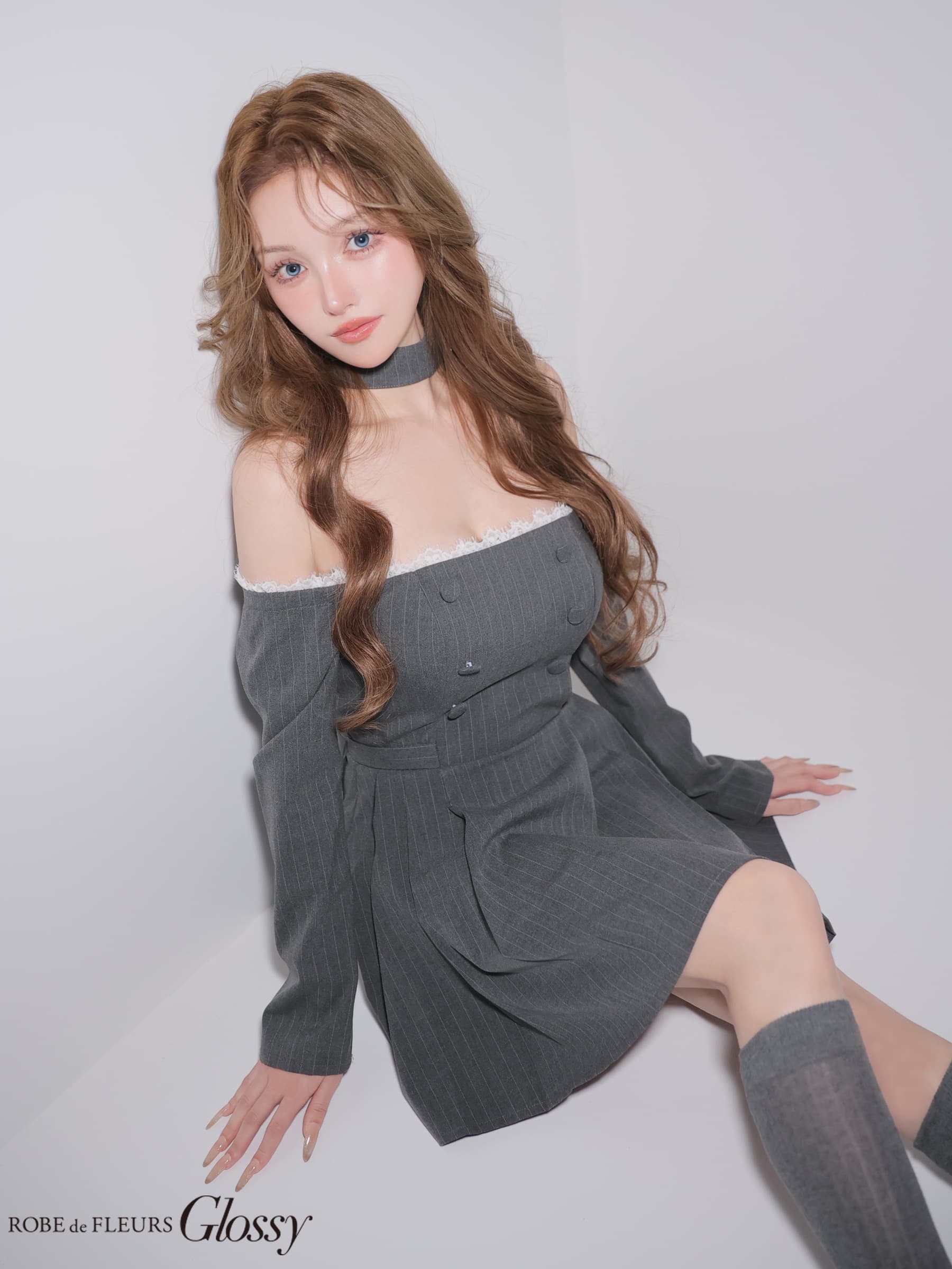 【予約商品/2月上旬発送予定】XSサイズあり【Glossy/グロッシー】ダブルボタン/ ストライプ / フレア/ ミニドレス / キャバドレス[OF08] [GL4800-GY-2602]