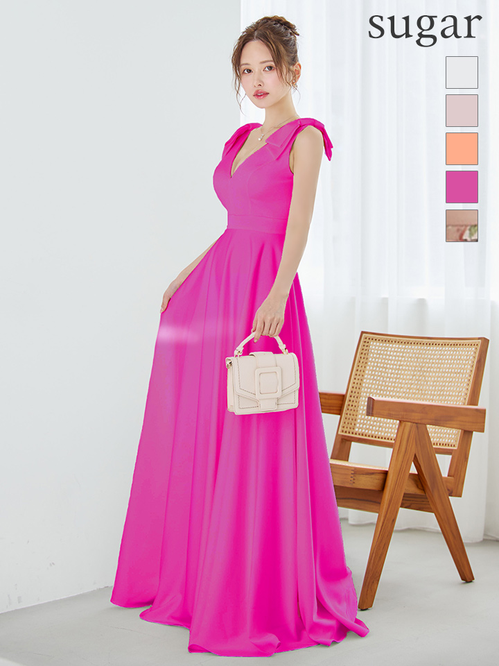 XS-Lサイズあり【SETTAN/セッタン】シンプル/ サテン/ ショルダーリボン/ Vネック/ Aライン/ ロングドレス / キャバドレス long[OF2] [LKS25158-VividP-S2602]