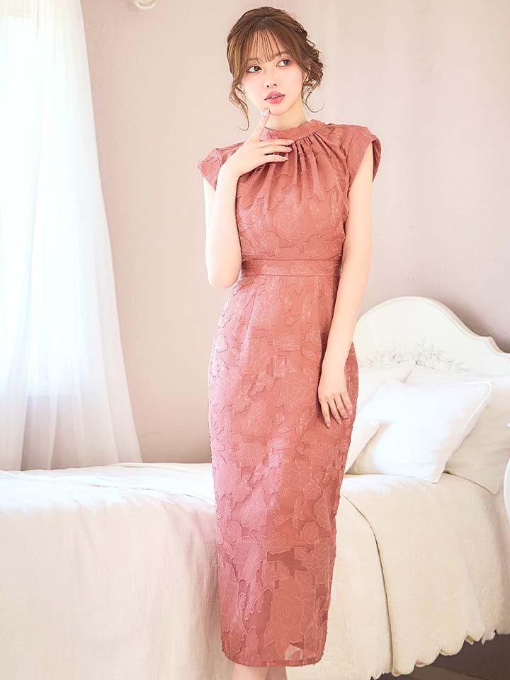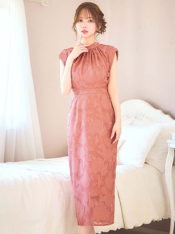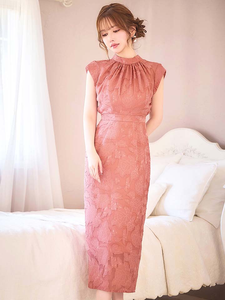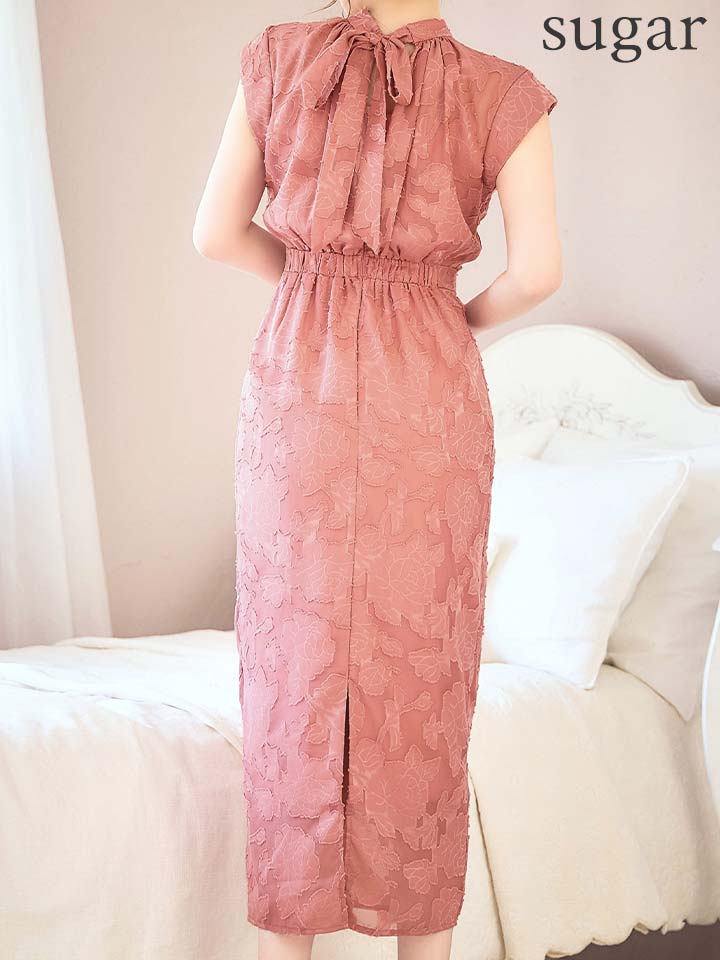 XLサイズあり【AMORA GRACE / アモーラグレース】 オケージョンドレス/ パーティードレス/ お呼ばれドレス/ フラワージャガード/ ハイネック/ リボン/ ハイウエスト/ ミモレ丈/ ミディアムドレス/ キャバドレス[OF05] [G60248HL-Apricot-S2602]
