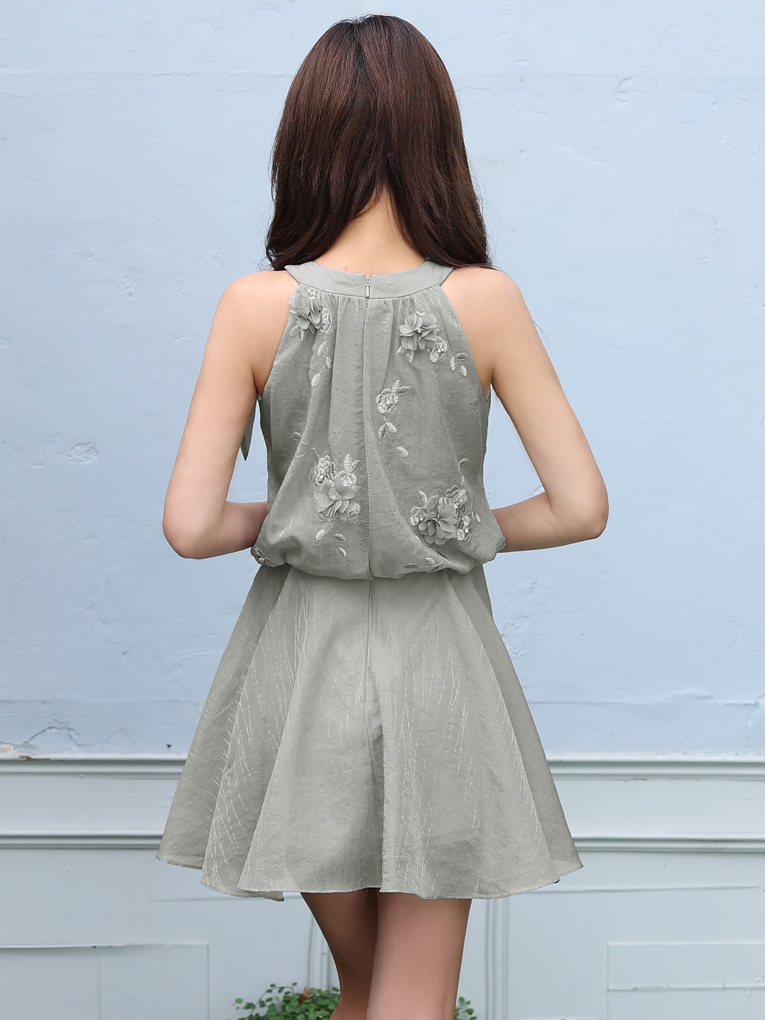 シアー感のある軽やかな生地に、立体的なフラワーモチーフをあしらった華やかなデザイン。