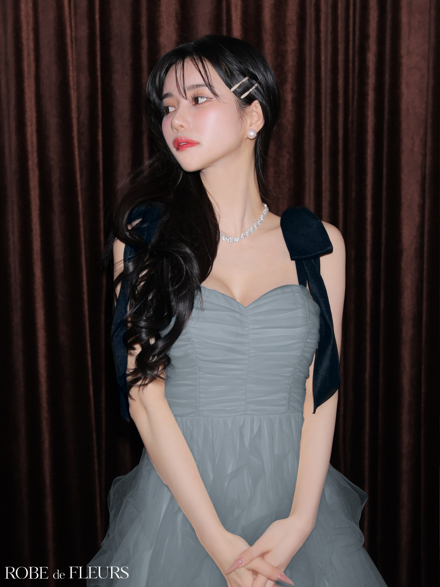 肩に施した大きなリボンがボディラインを華奢に見せてくれます。