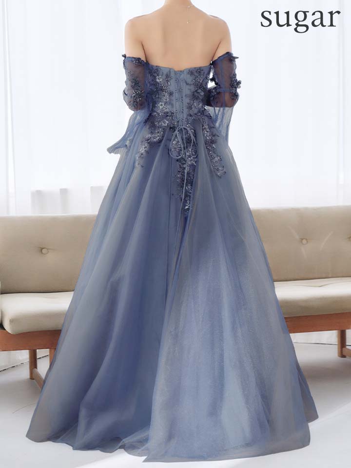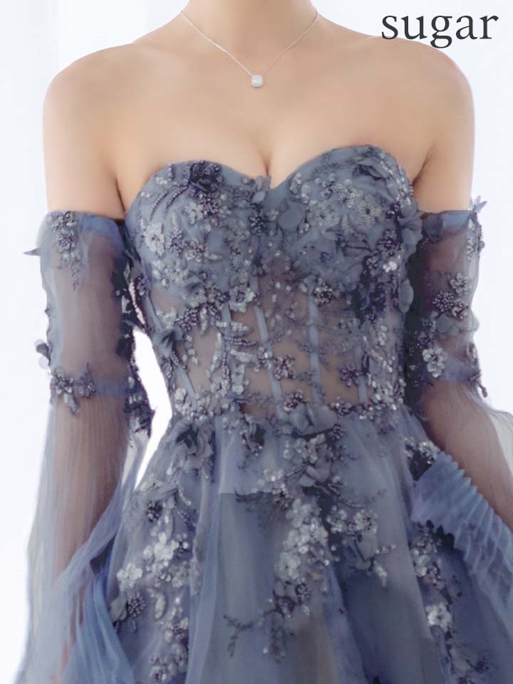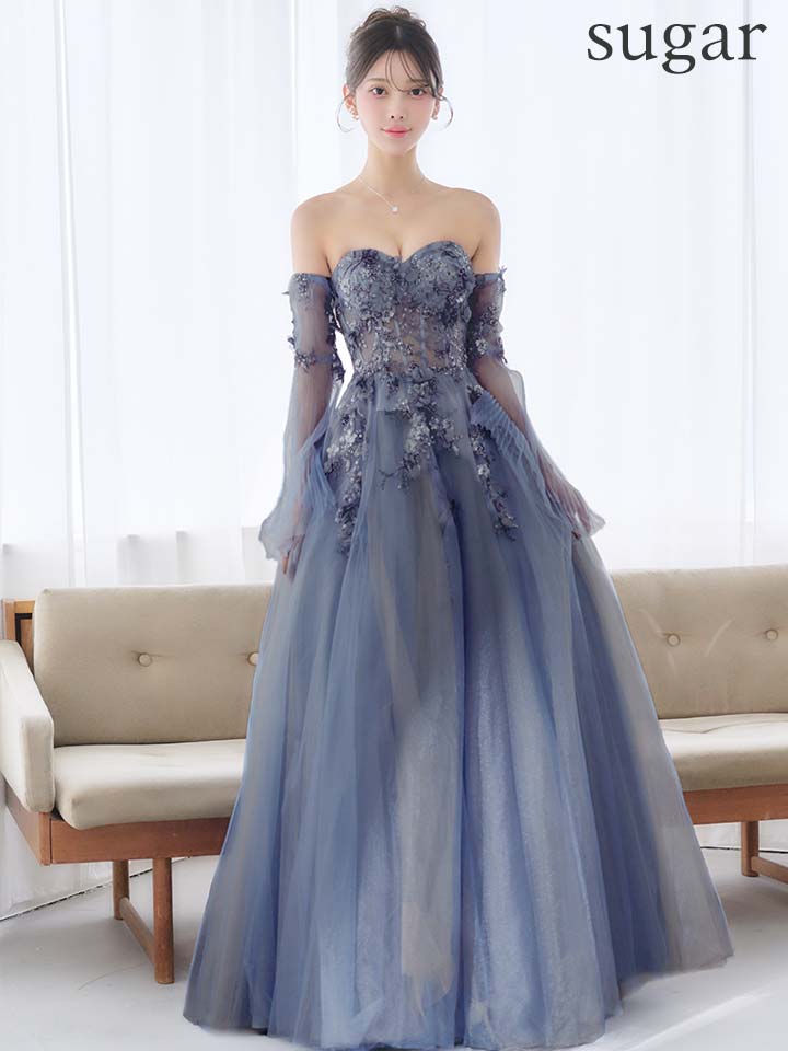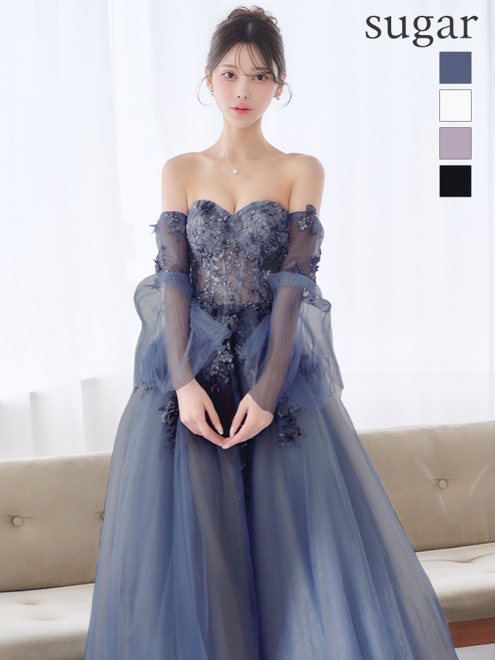 【JEAN MACLEAN/ジャンマクレーン】チョーカー/ 袖付き/ 2way/ オフショル/ ロングスリーブ/ 立体フラワー/ シアー/ チュール/ スパンコール/ ビーズ刺繍/ フレア/ プリンセス/ ロングドレス/ キャバドレス long[OF2A] [61037-JM-W-S2602]