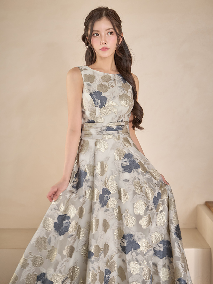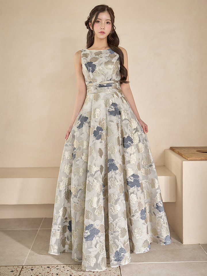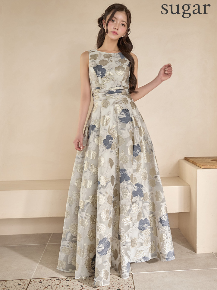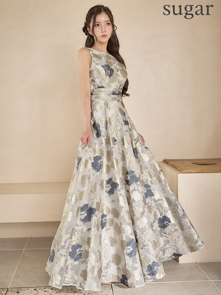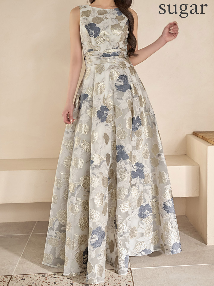 金糸の花柄がエレガントで高級感溢れるフレアロングドレス。