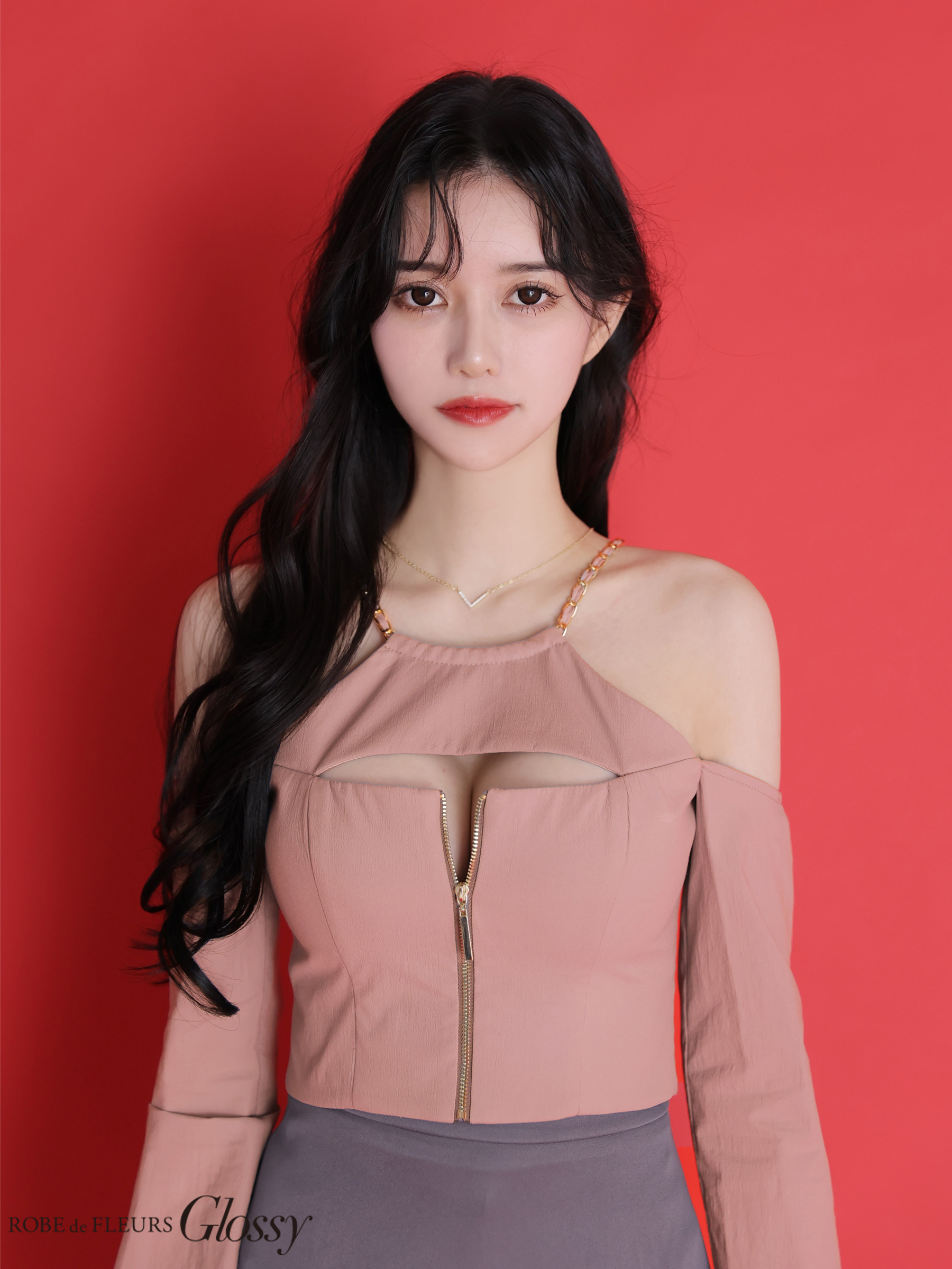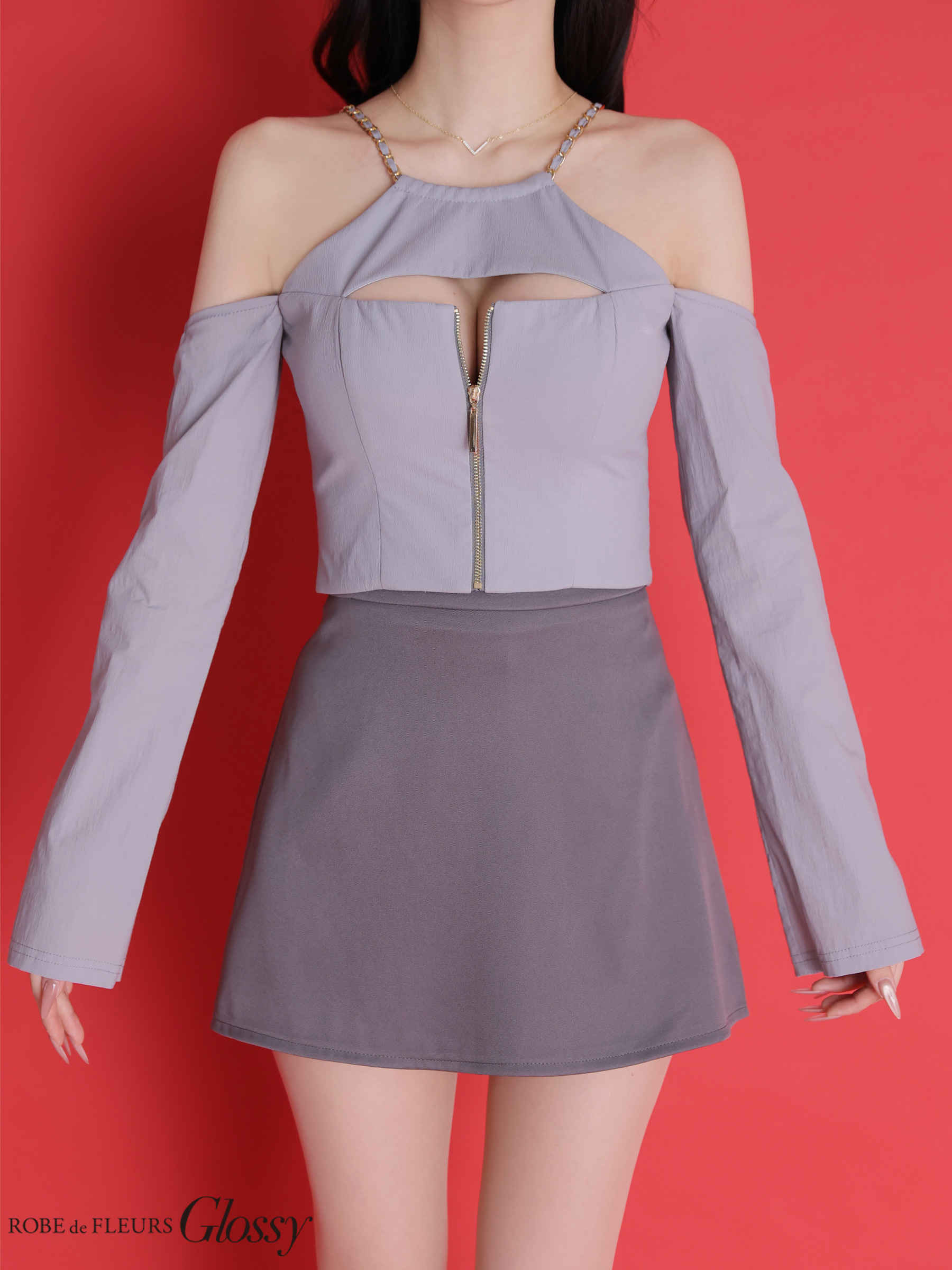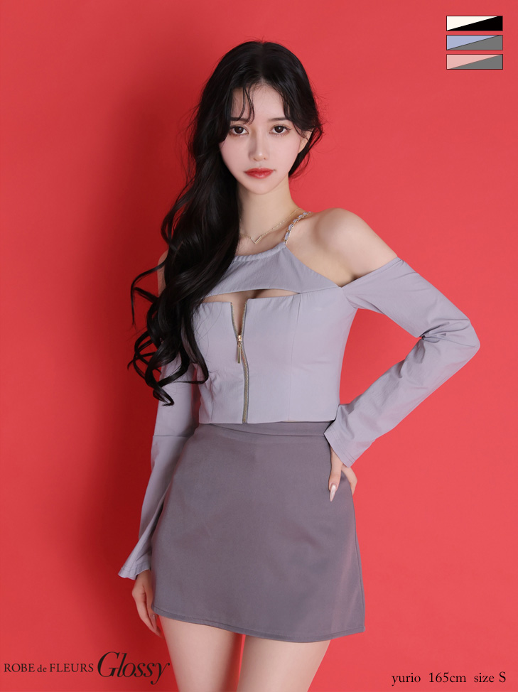 【予約商品/3月上旬発送予定】XSサイズあり【Glossy/グロッシー】チェーンストラップ/ フロントジップ/ バイカラー/ セットアップ/ ミニドレス/ キャバドレス[OF08] [GL4160-IVxB-2602]