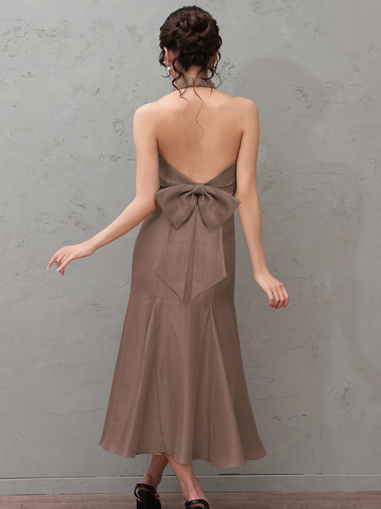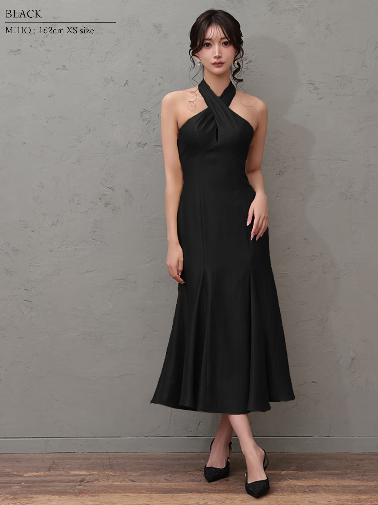 首元でクロスするホルターネックデザインが、洗練された印象を与えるロングドレス。