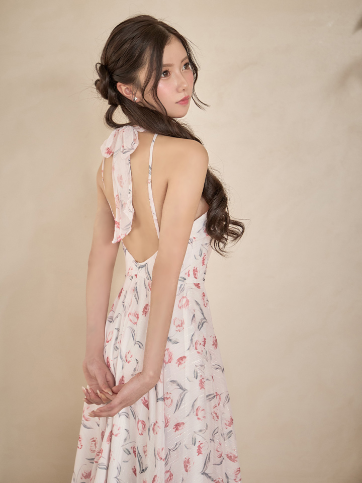 【予約商品/2月下旬発送予定】XSサイズあり【an /アン】フラワープリント/ ホルターネック/ フリル/ ワンピース/ フレア/ Aライン/ ミディアムドレス/ キャバドレス[OF05] [AOC4085-P-S260210]