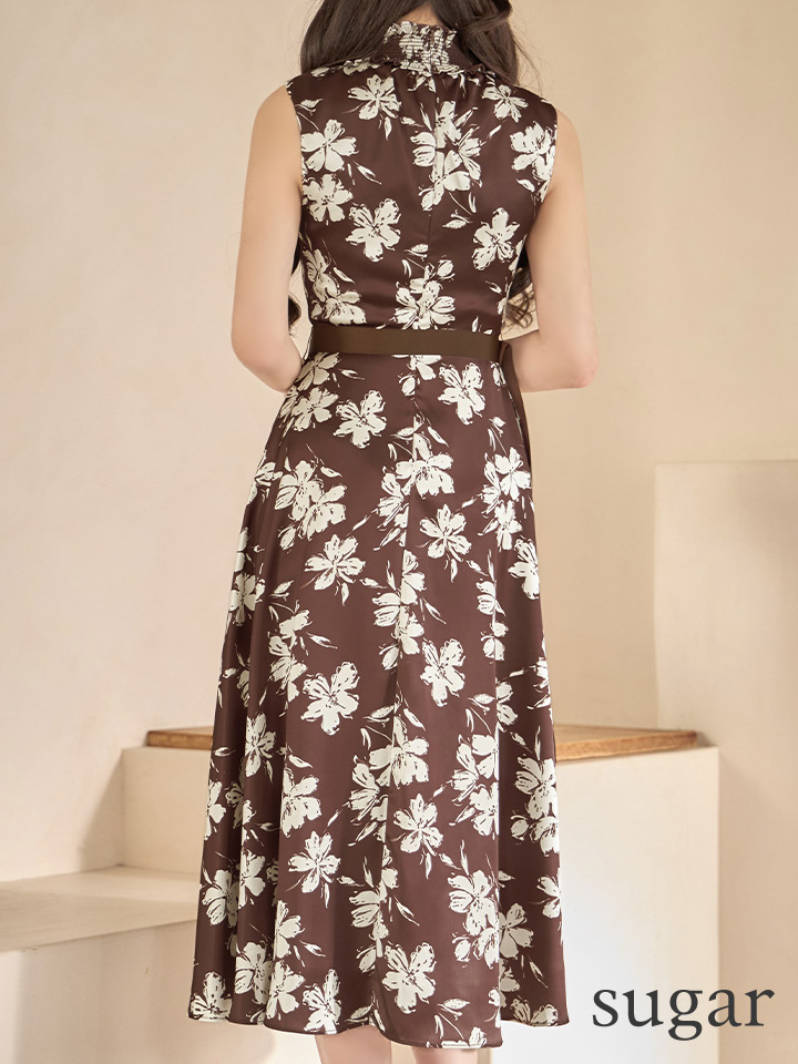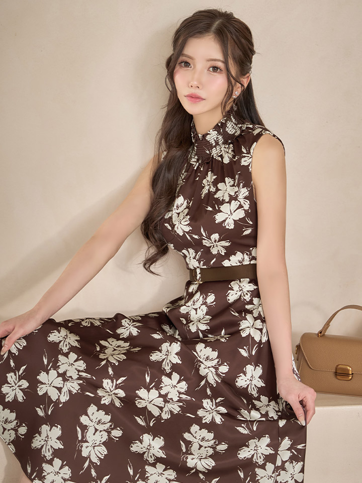 XS-Lサイズあり【GINZA COUTURE/銀座クチュール】フラワープリント/ バイカラー/ ベルト/ ノースリーブ/ ハイネック/ Aライン/ フレア/ ワンピース/ ミディアムドレス/ キャバドレス[OF2] [LKC25295-BRxW-S260210]