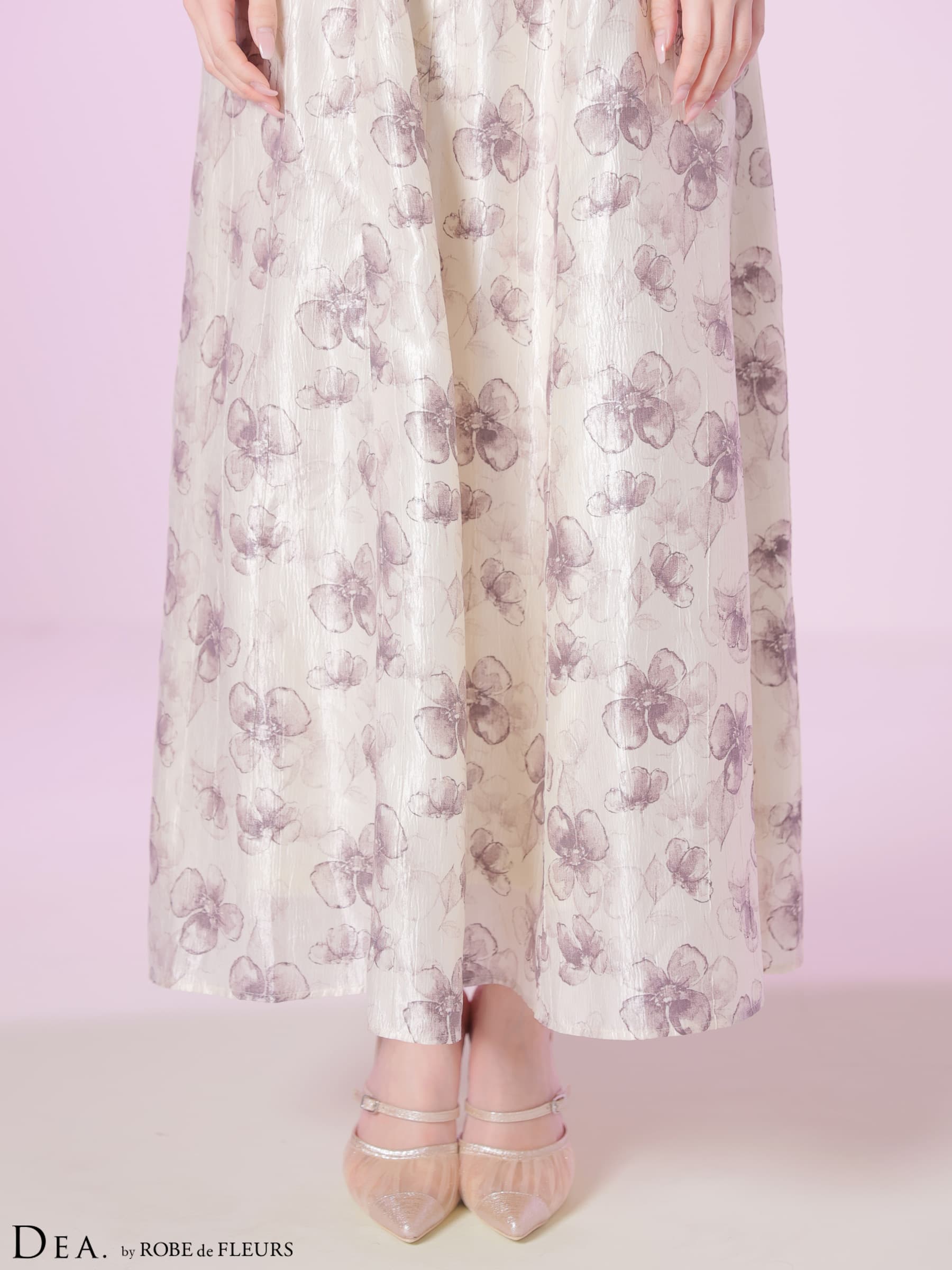 ツヤ感のあるサテン生地に大ぶりの花柄をあしらったロングワンピ。