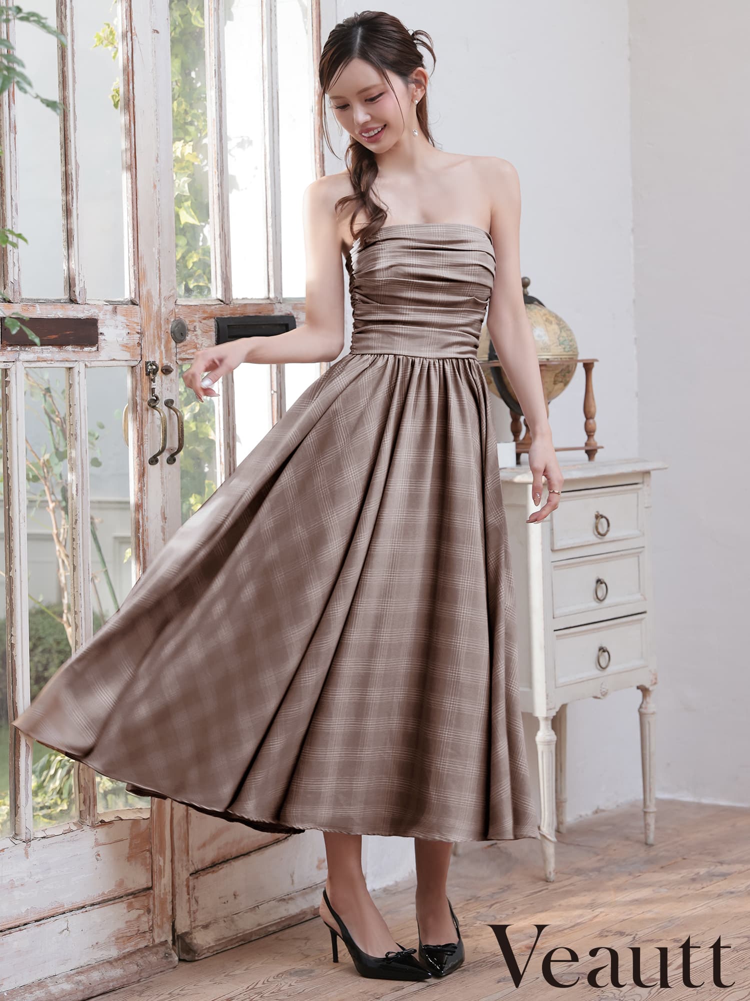 XSサイズあり【Veautt/ヴュート】【OF05】ベアトップ/ ギャザー/ チェック/ 2way/ フレア/ ワンピース/ ミディアムドレス/ キャバドレス [VT082607-BL-2602]