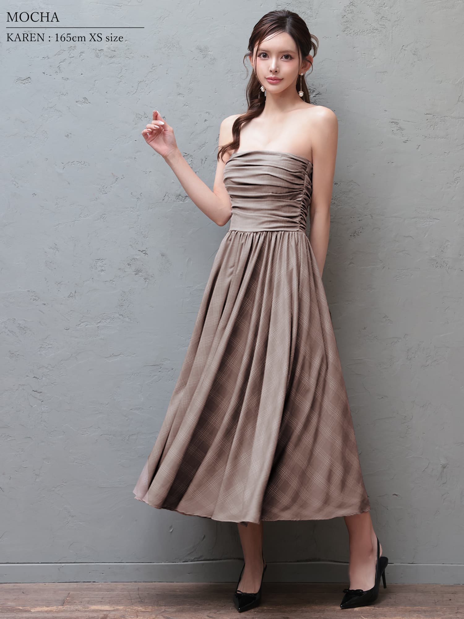 胸元に施したギャザーデザインが、デコルテを美しく引き立てるベアトップドレス。
