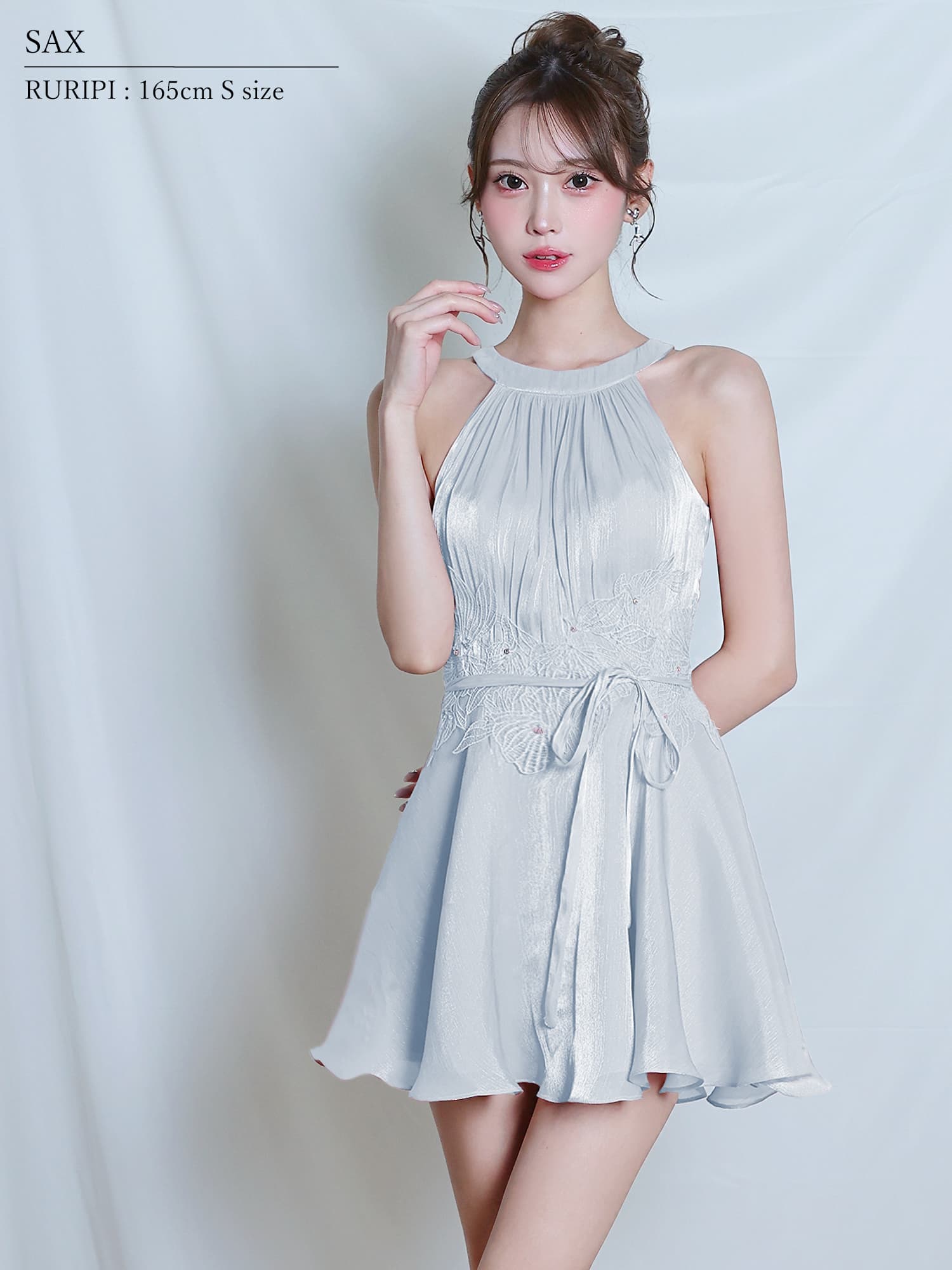 首元のホルターネックデザインがデコルテを美しく引き立て、縦に入ったギャザーが上半身をすっきりと見せてくれる一着。