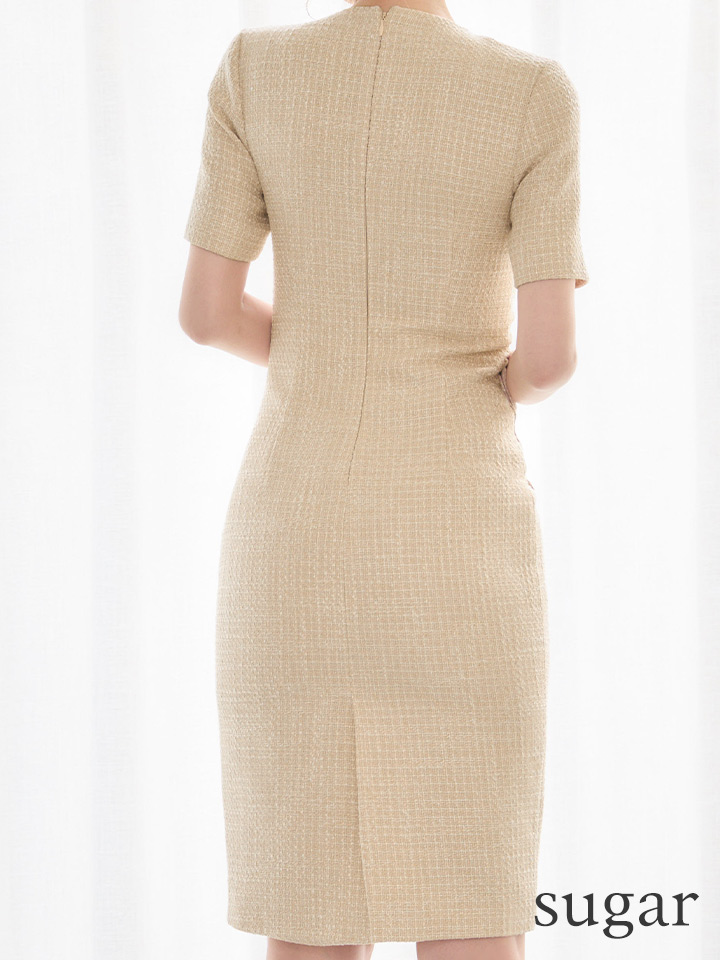 XS-Lサイズあり 【GINZA COUTURE/銀座クチュール】ビジューボタン/ ツイード/ 半袖/ 袖あり/ タイト/ 膝丈/ ワンピース/ ミディアムドレス/ キャバドレス[OF2] [LKC2814-BE-S2602]