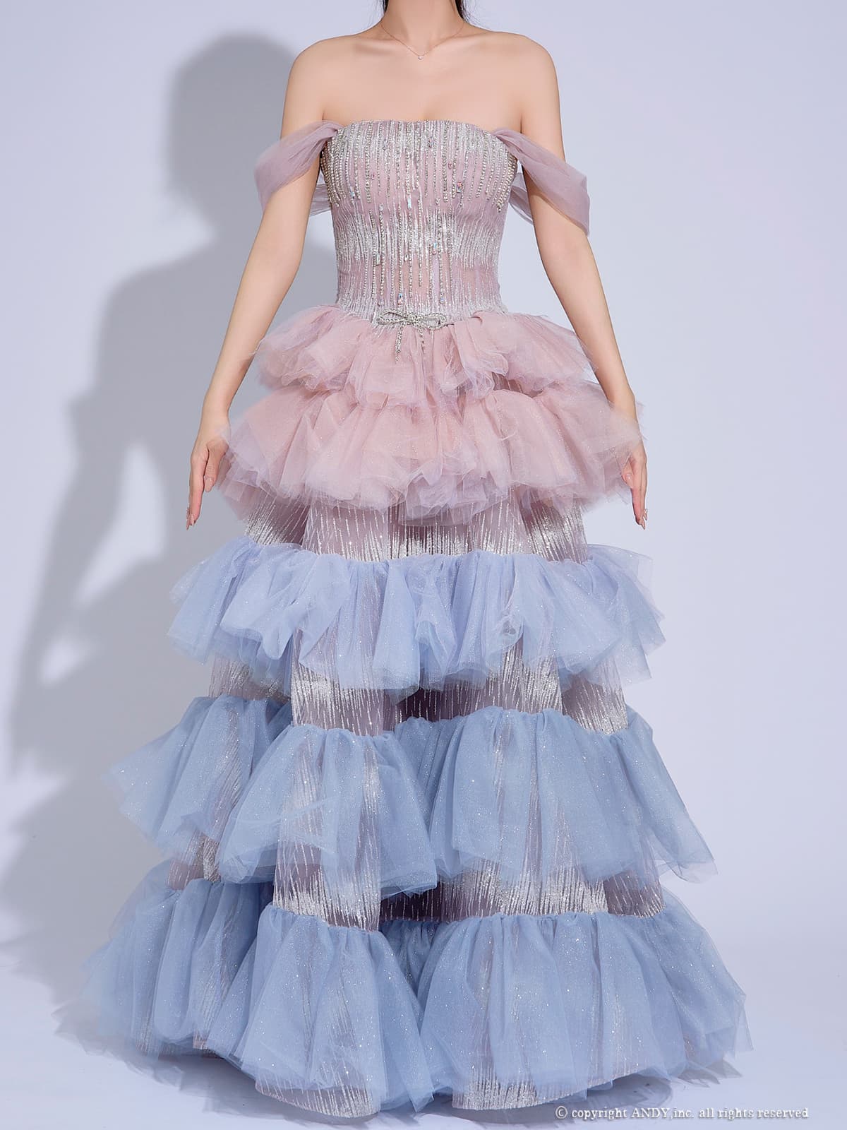 【couture an/クチュールアン】オフショル/ チュール/ ティアードフリル/ ラメ/ ラインストーン/ ビジュー/ リボン/ スパンコール/ バイカラー/ フレア/ プリンセス/ ロングドレス/ キャバドレス long[OF05] [AOC-WD-058-PBL-2602]