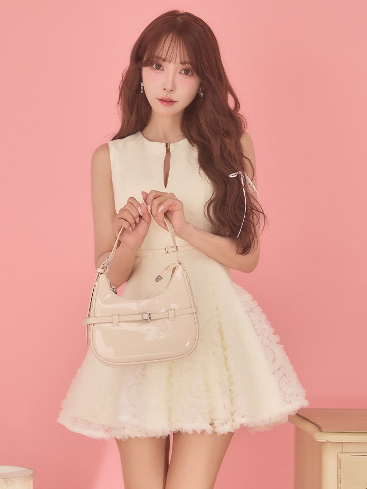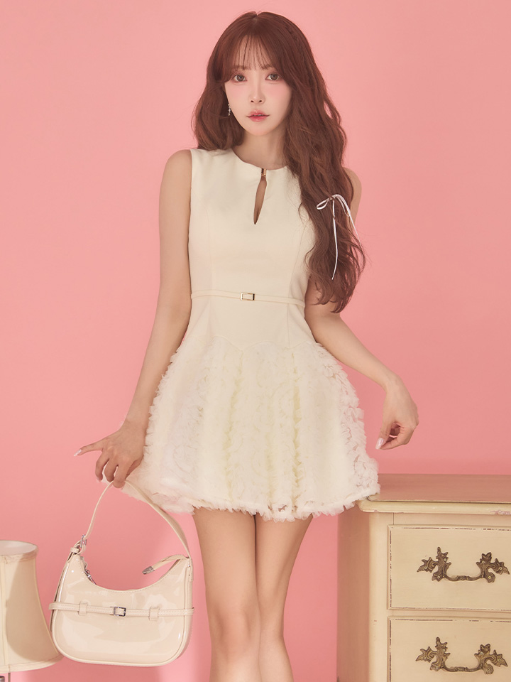 ボリュームのある立体チュールレースが存在感のあるミニワンピ。