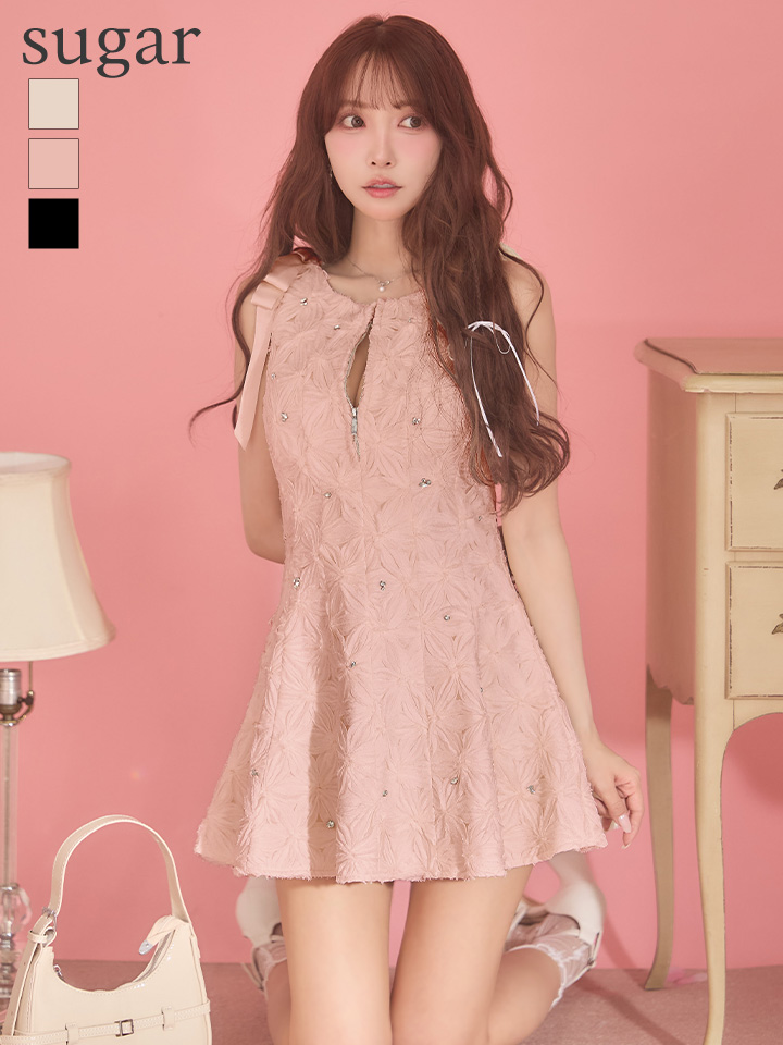 【予約商品/3月上旬発送予定】XSサイズあり【ROBE de FLEURS/ローブドフルール】フラッフィーフラワー/ ビジュー/ ショルダーリボン/ バストジップ/ ノースリーブ/ フレア/ Aライン/ ミニドレス/ キャバドレス[OF08] [FM4360-B-S260214]