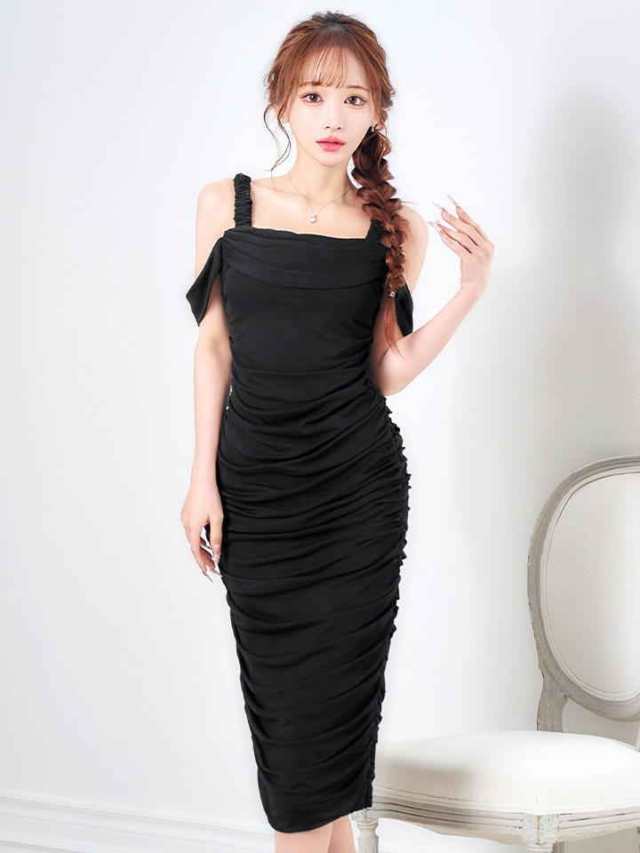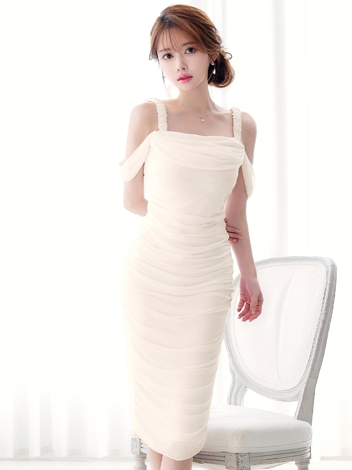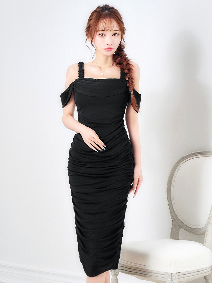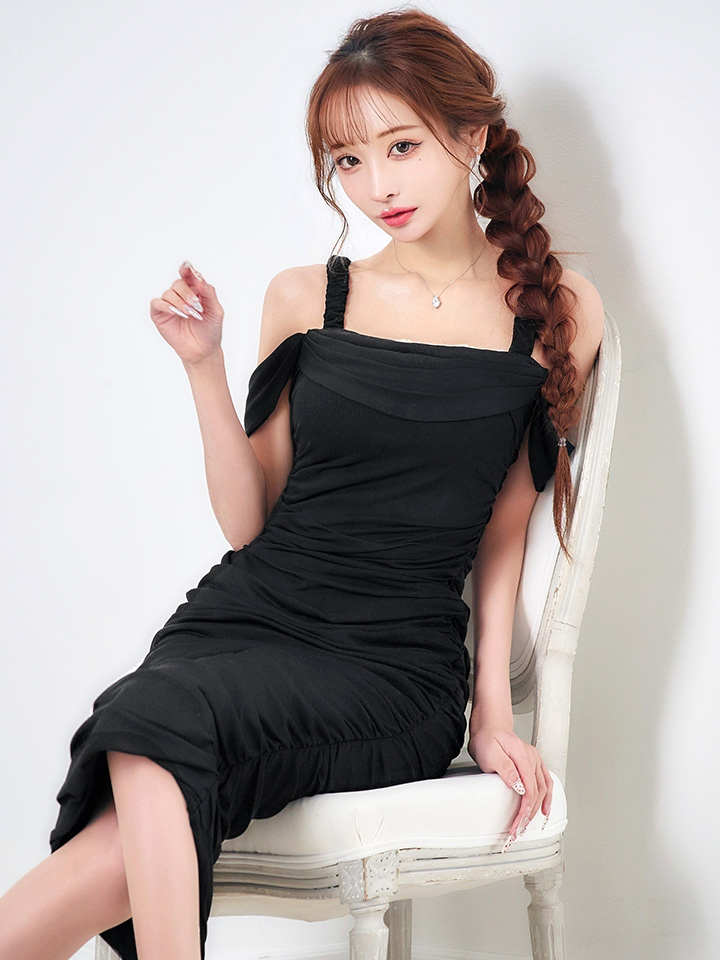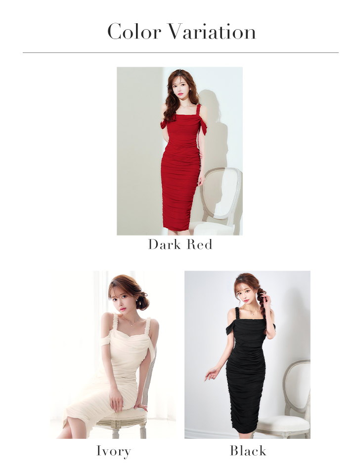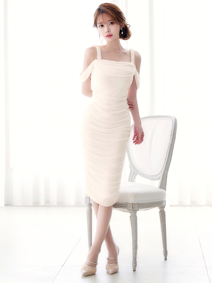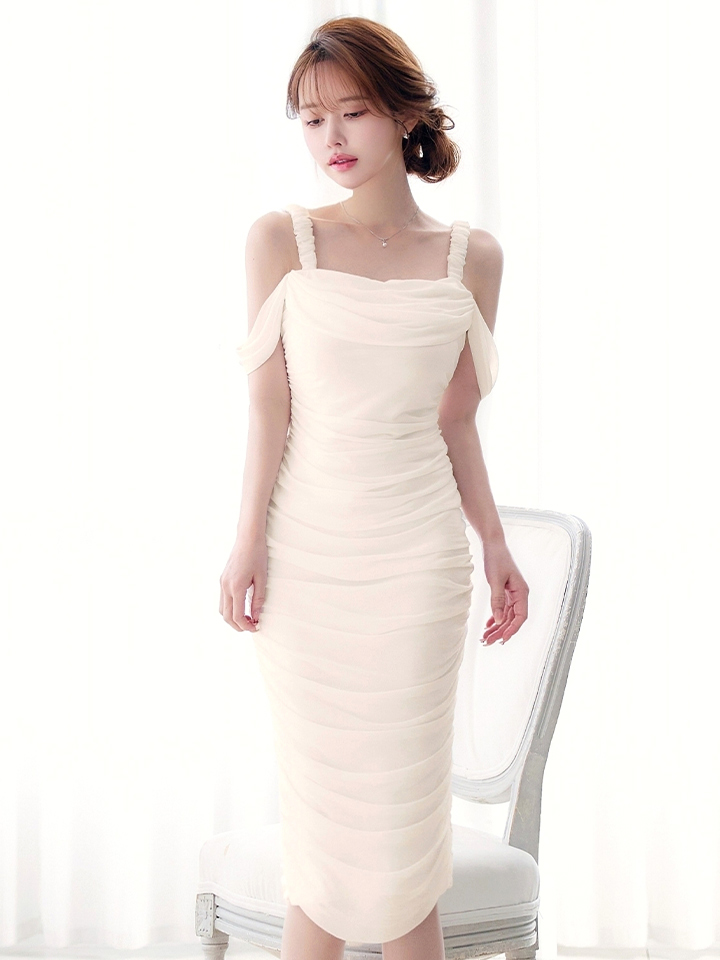 オフショルで肩出しした上品なミディアムドレス
