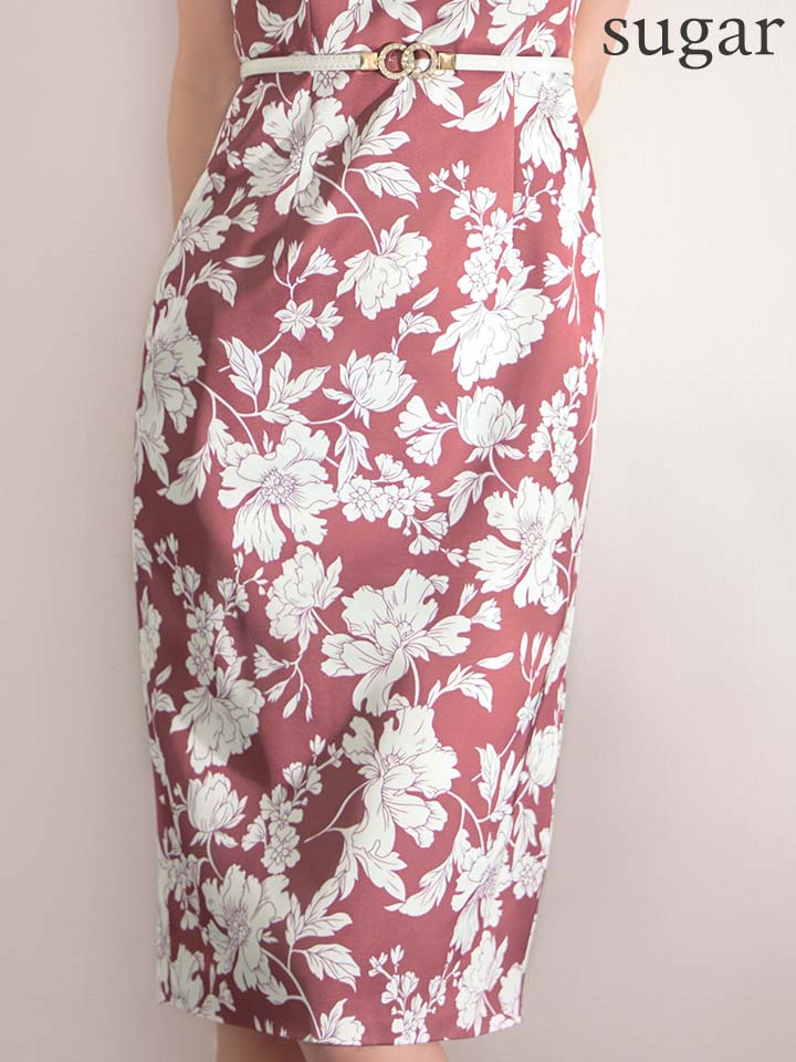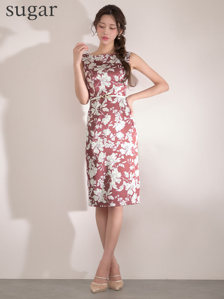 XS-Lサイズあり【GINZA COUTURE/銀座クチュール】サテン/ 花柄プリント/ ベルト付き/ ボートネック/ ノースリーブ/ タイト/ ミディアムドレス/ キャバドレス[OF2 [LKC25291-BRxW-S2602]