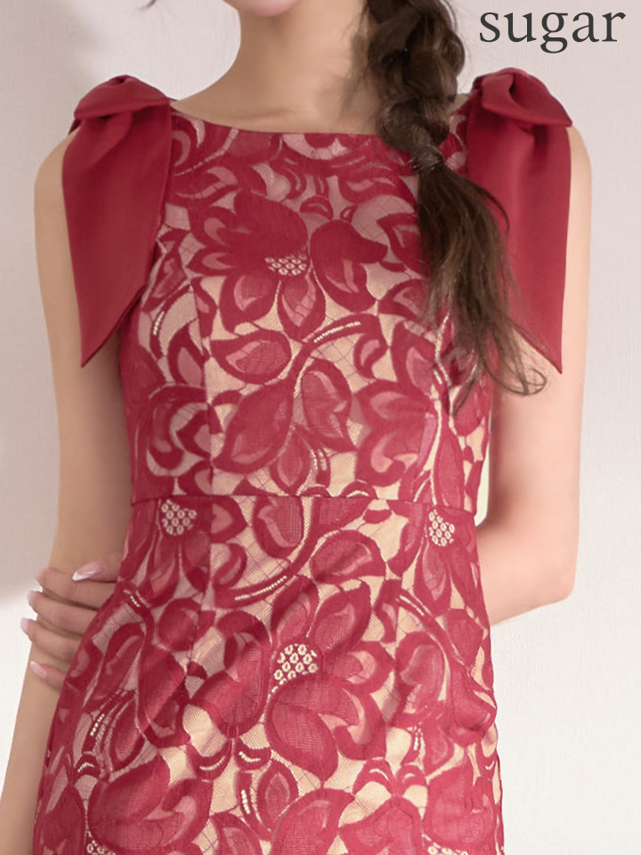 XS-Lサイズあり 【GINZA COUTURE/銀座クチュール】総レース/ ショルダーリボン/ ノースリーブ/ タイト/ 膝丈/ ミディアムドレス/ キャバドレス[OF2] [LKC25302-R-S2602]