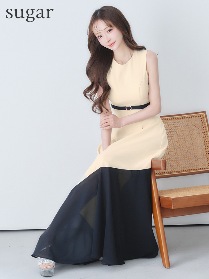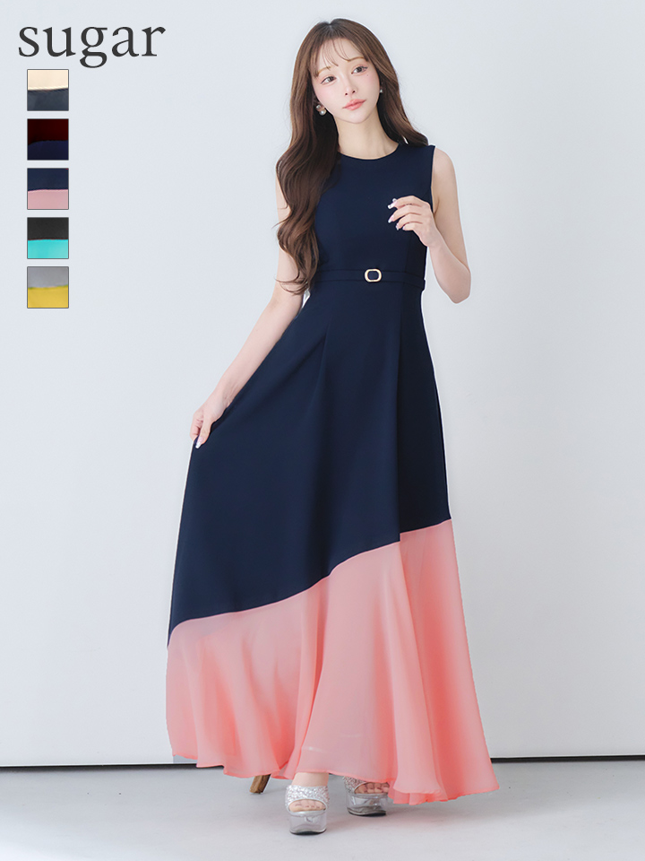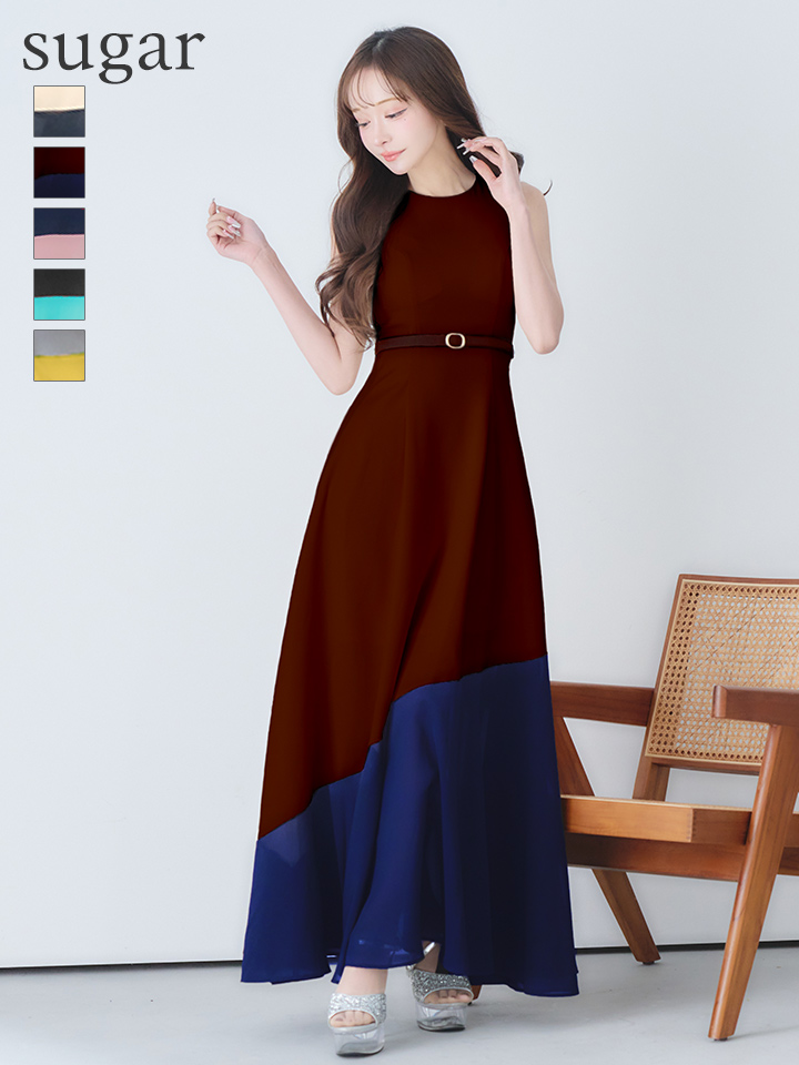 バイカラーデザインが目を惹く大人上品なフレアロングドレス