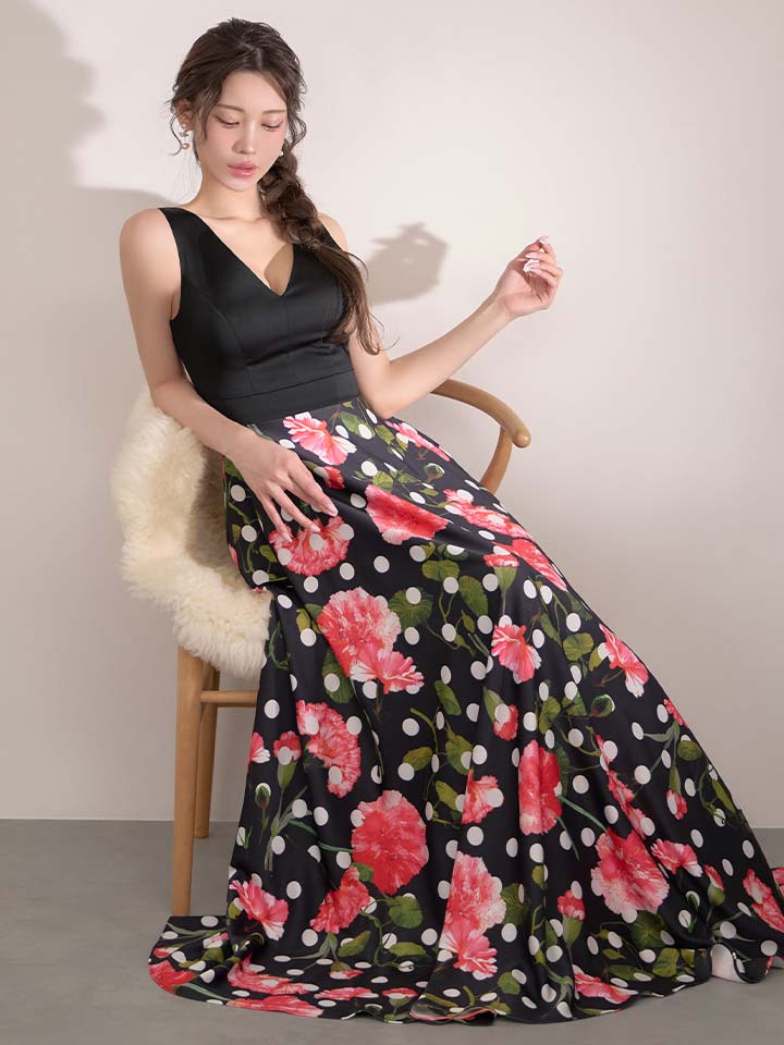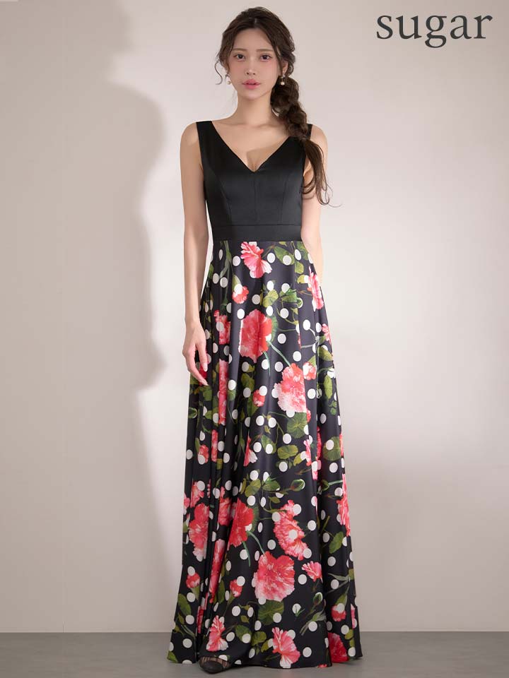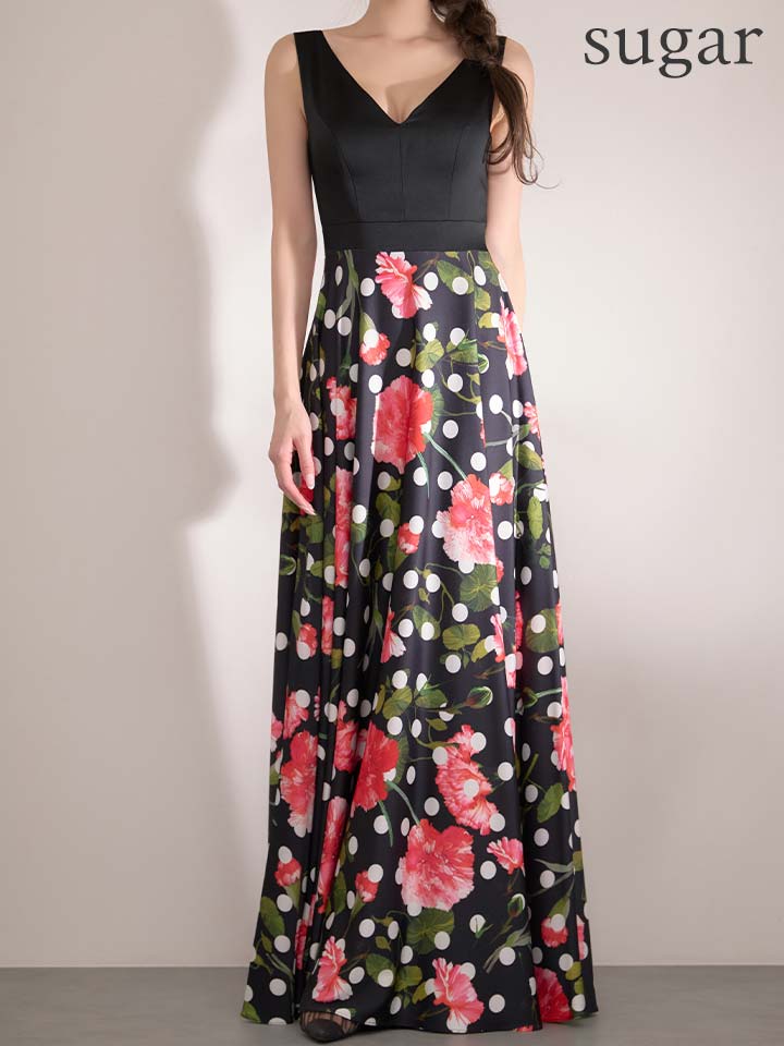ドット×フラワープリントが目を惹くAラインロングドレス。