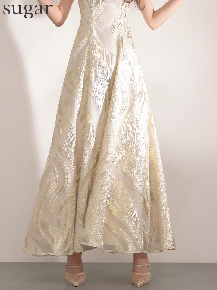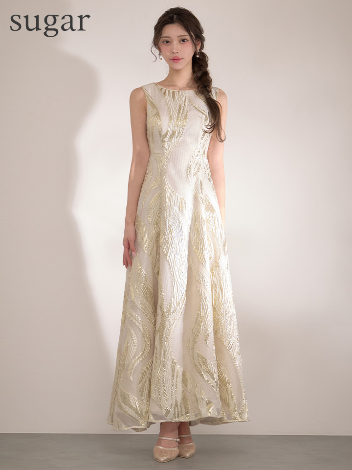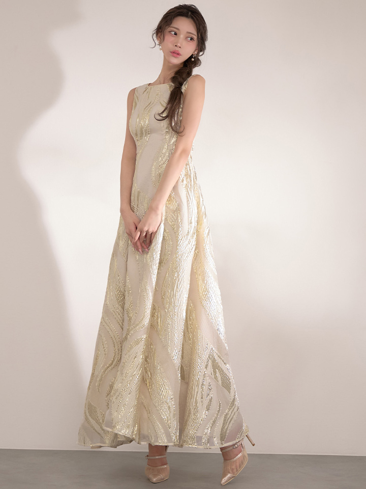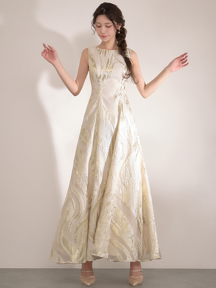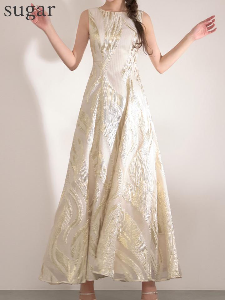 XS-Lサイズあり【SETTAN/セッタン】金糸/ プリント/ オーガンジー/ ボートネック/ ノースリーブ/ フレア/ ワンピース/ ロングドレス / キャバドレス long[OF2] [LKS25296-IV-S2602]