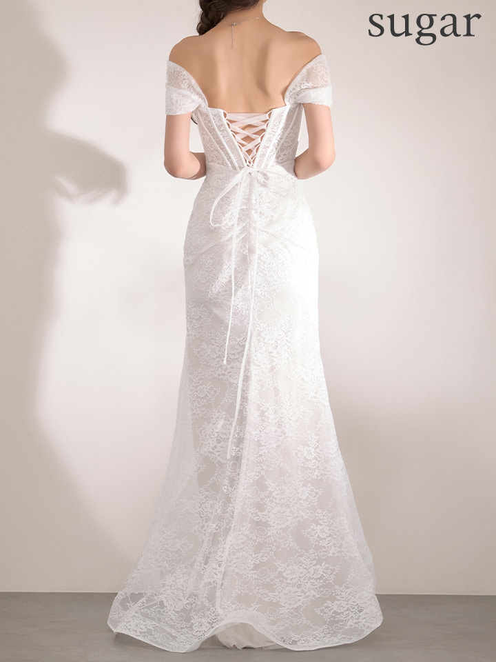 オフショルダーの繊細な総レースのロングドレスです。