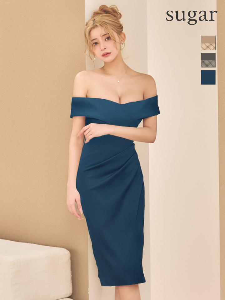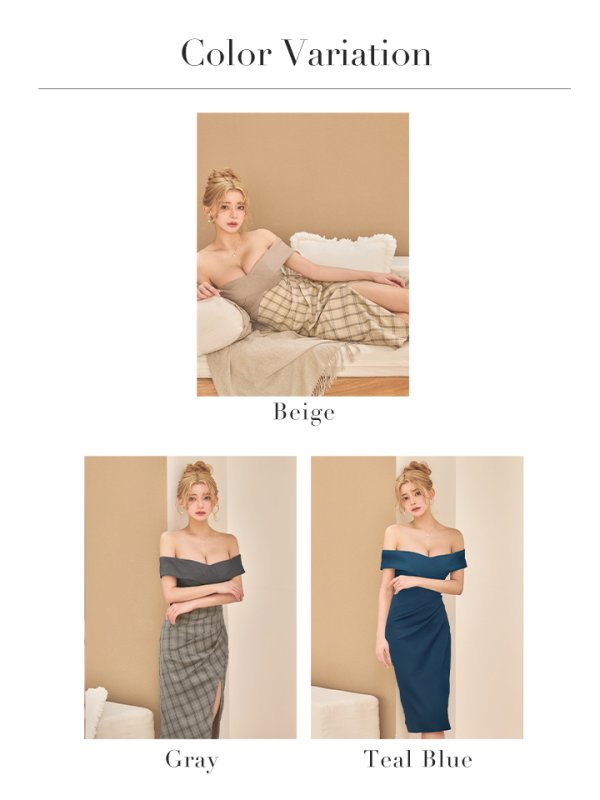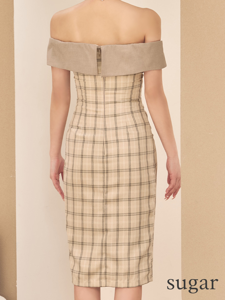 XSサイズあり【Veautt/ヴュート】【OF05】オフショルダー/ ウエストタック/ チェック/ バイカラー/ 2way/ タイト/ ミディアムドレス/ キャバドレス [VT032602-GY-S260219]