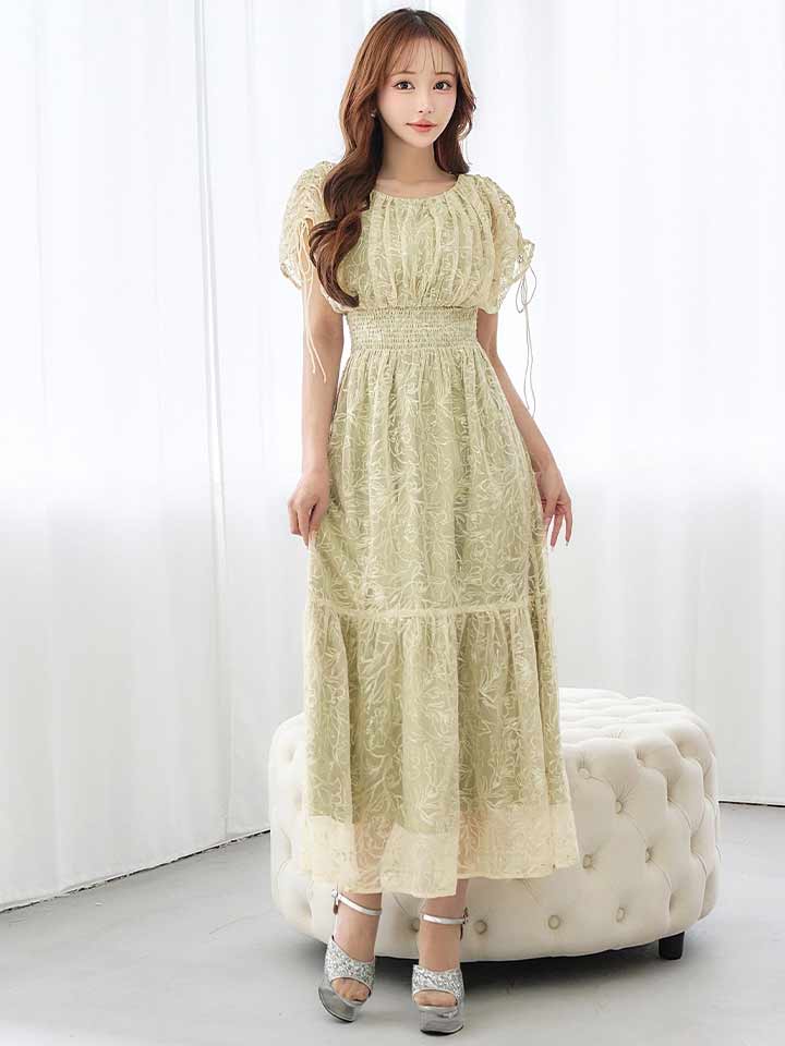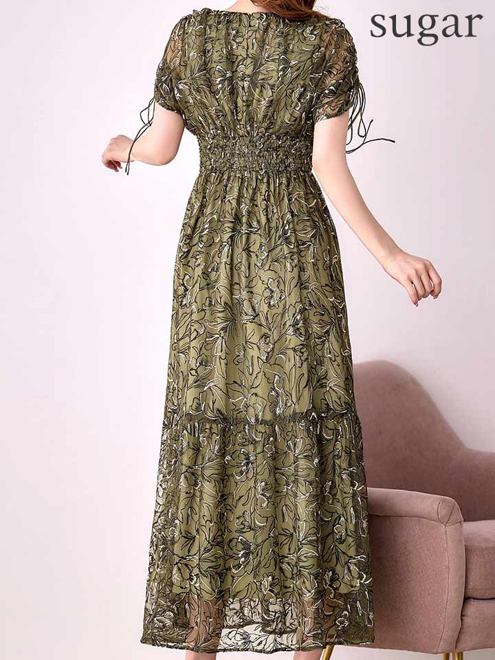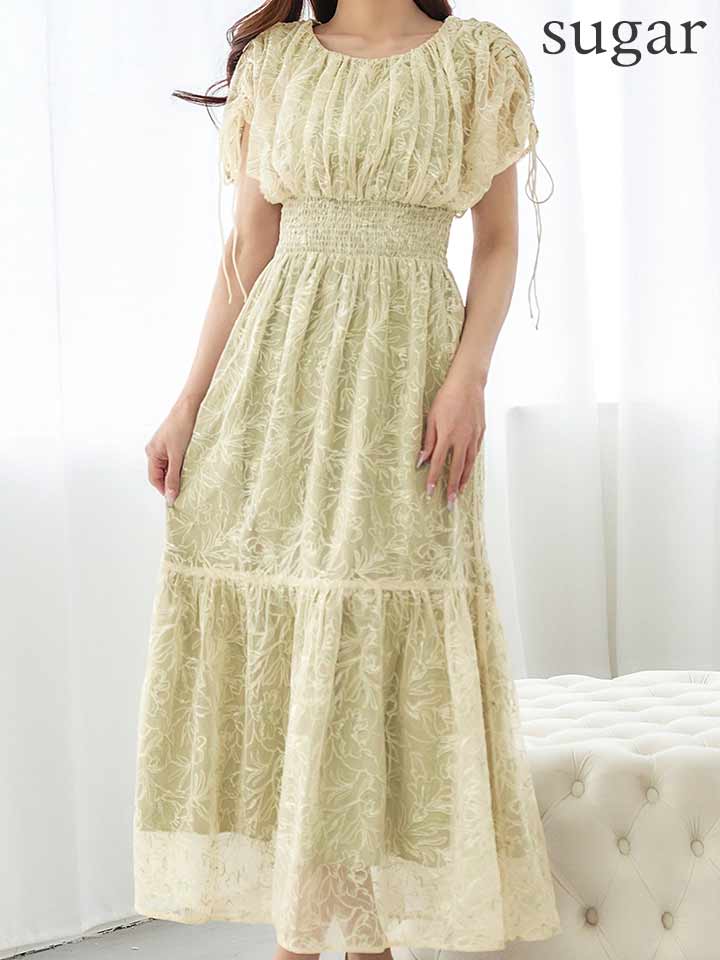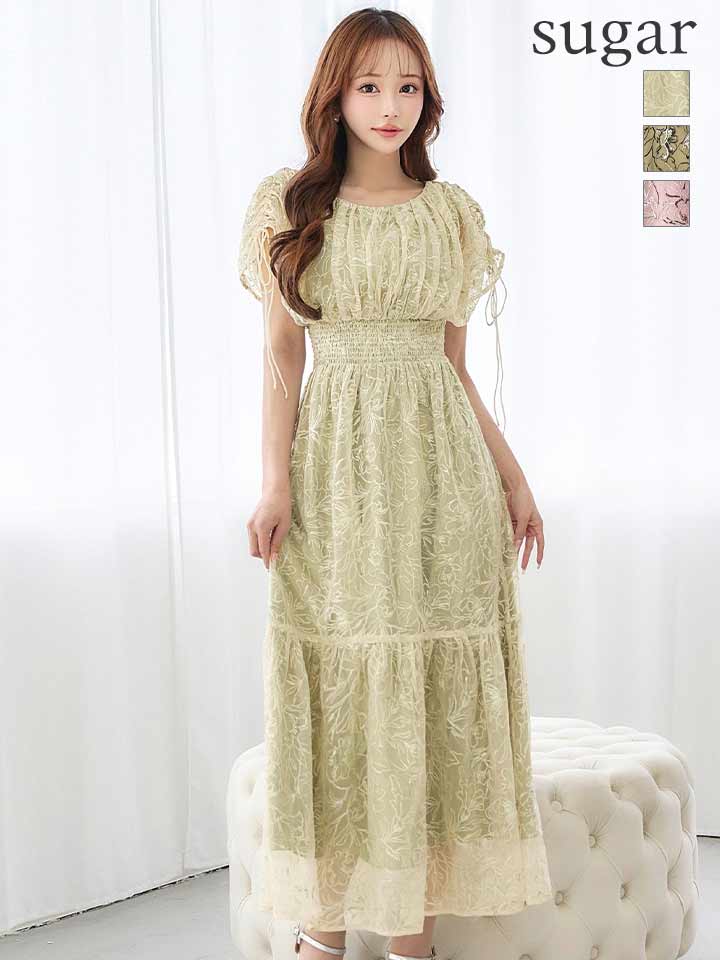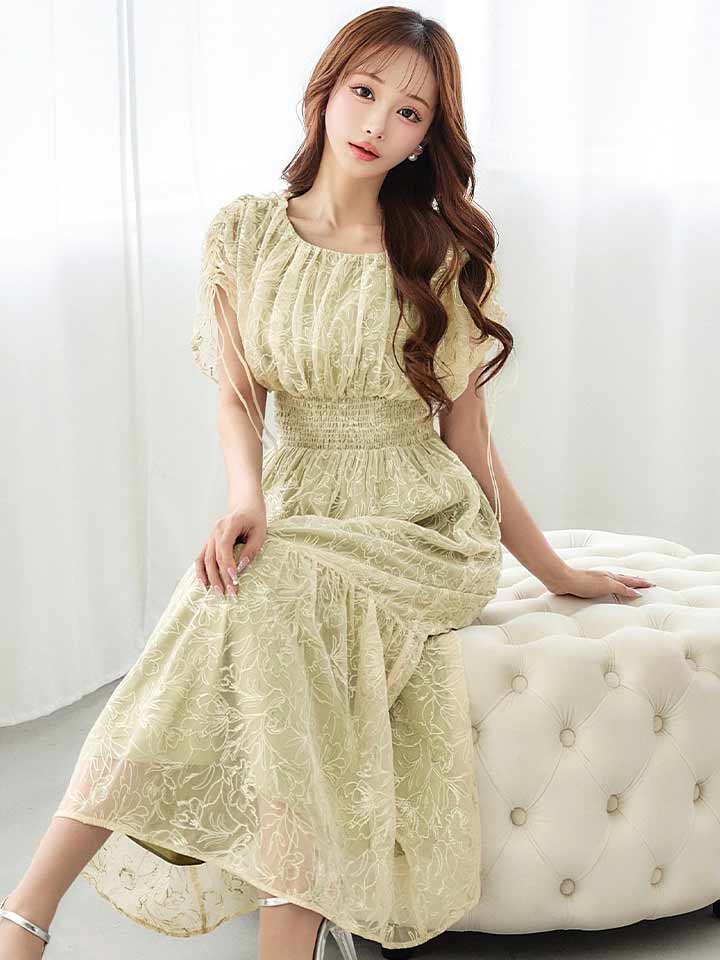 フラワー刺繍とさりげない透け感が上品な雰囲気のミモレ丈ワンピースドレス