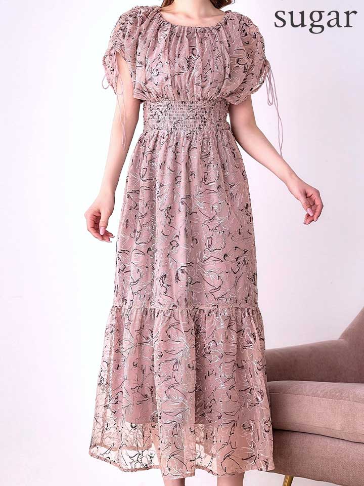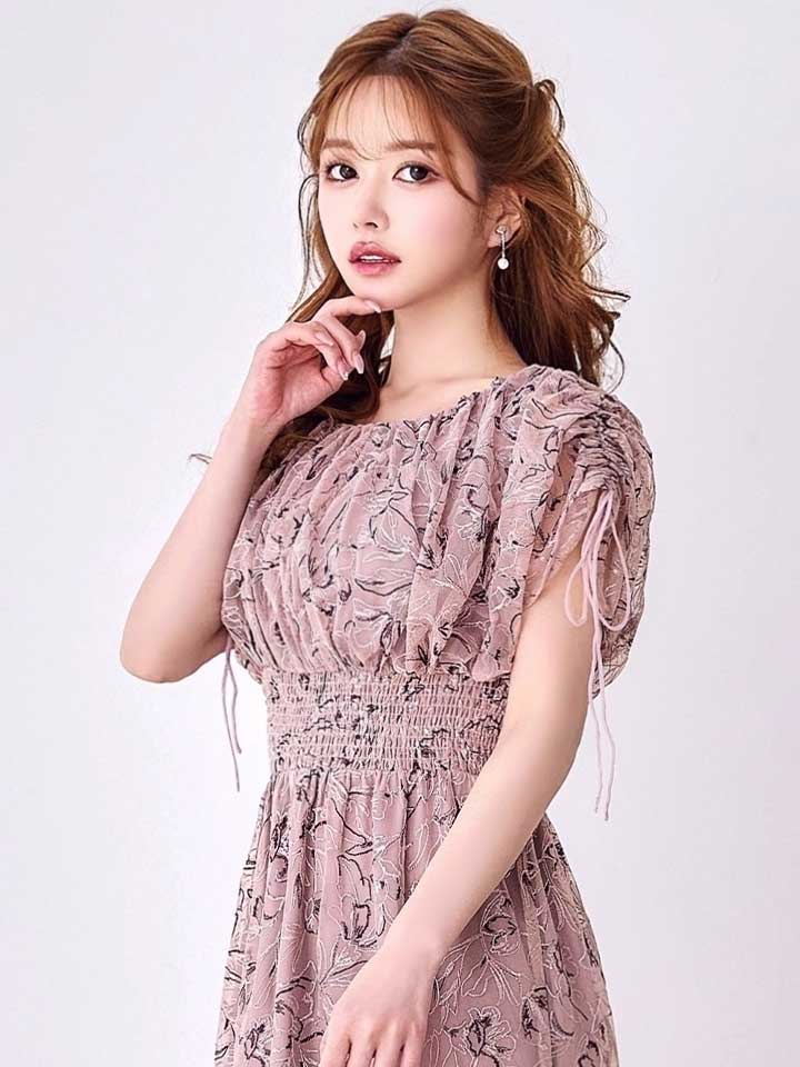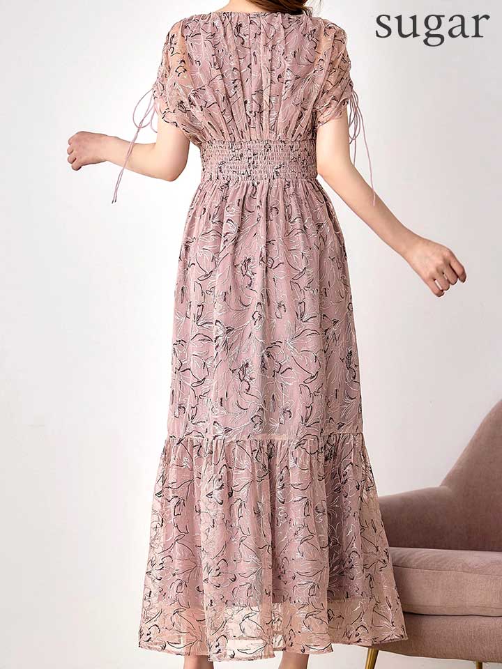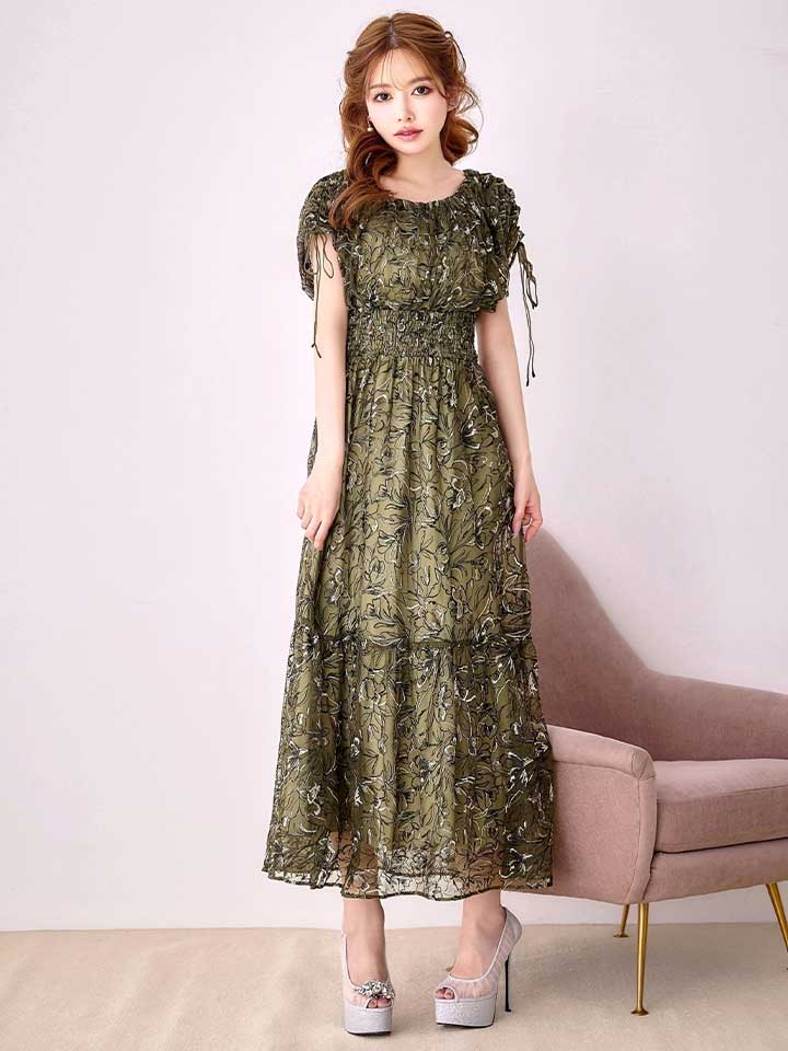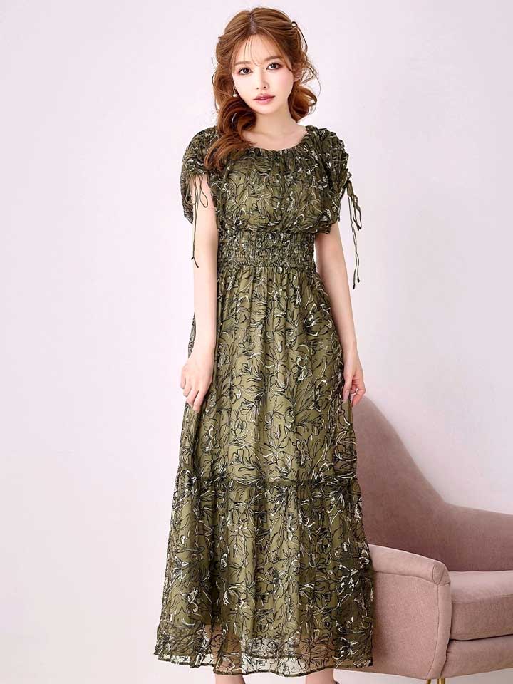 フラワー刺繍とさりげない透け感が上品な雰囲気のミモレ丈ワンピースドレス