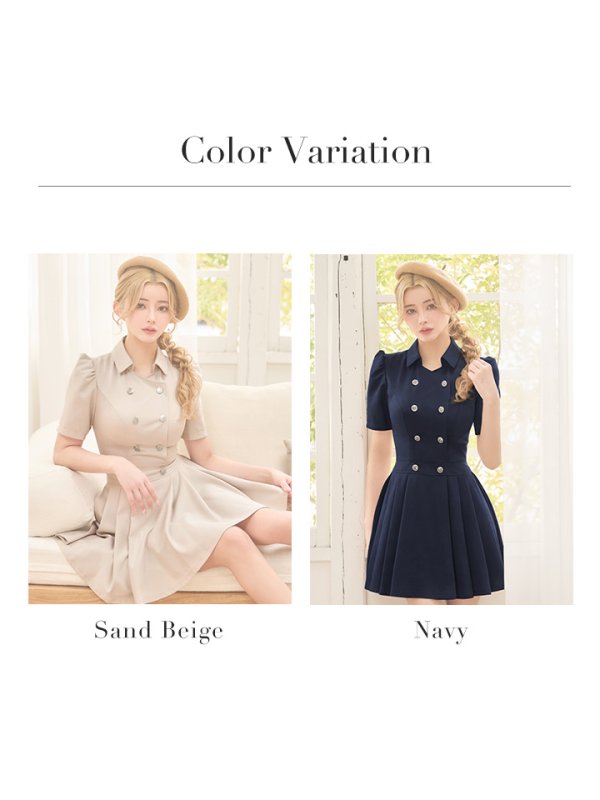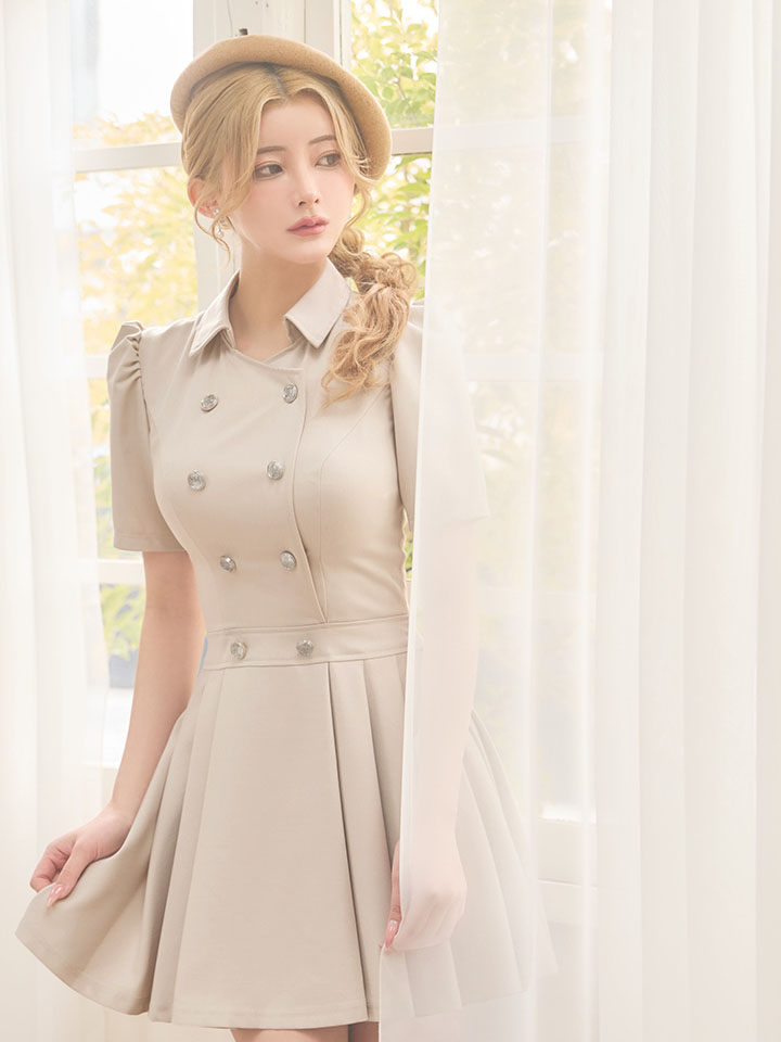 【予約商品/2月下旬発送予定】XSサイズあり【IRMA/イルマ】袖あり/ パフスリーブ/ 襟付き/ プリーツ/ ダブルボタン/ ストレッチ/ 半袖/ ハイウエスト/ フレア/ ミニドレス/ キャバドレス[OF2A] [61045-IR-NV-S260220]