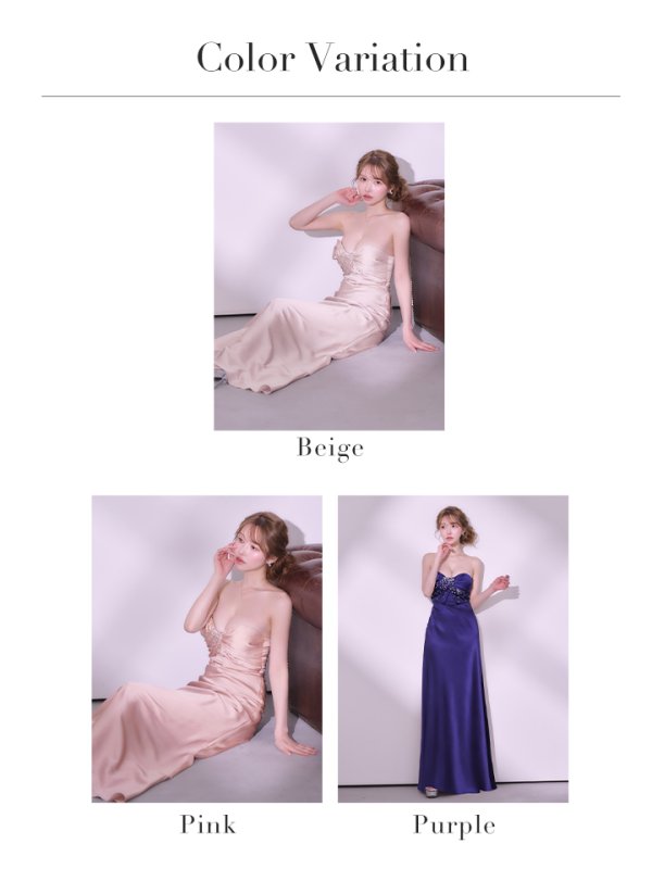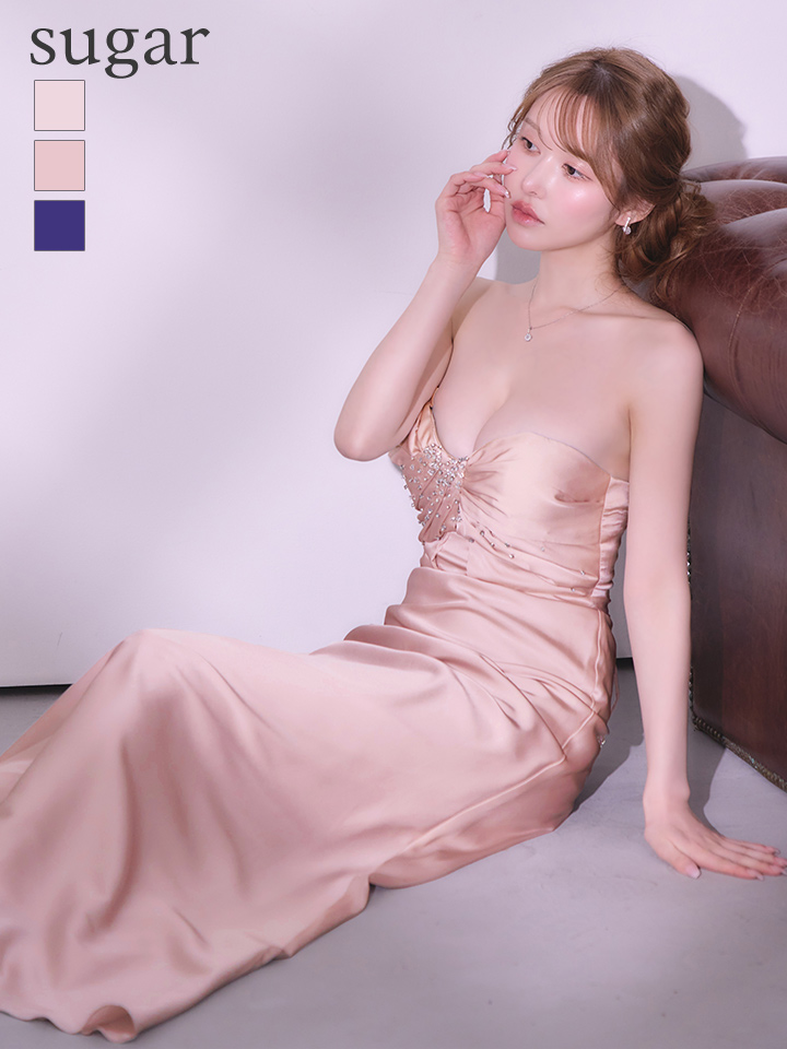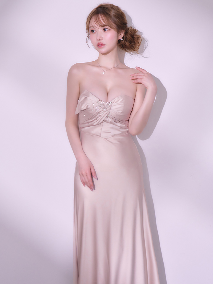 胸元に立体的なドレープとビジュー装飾を施し、上品な華やかさを演出するデザイン。