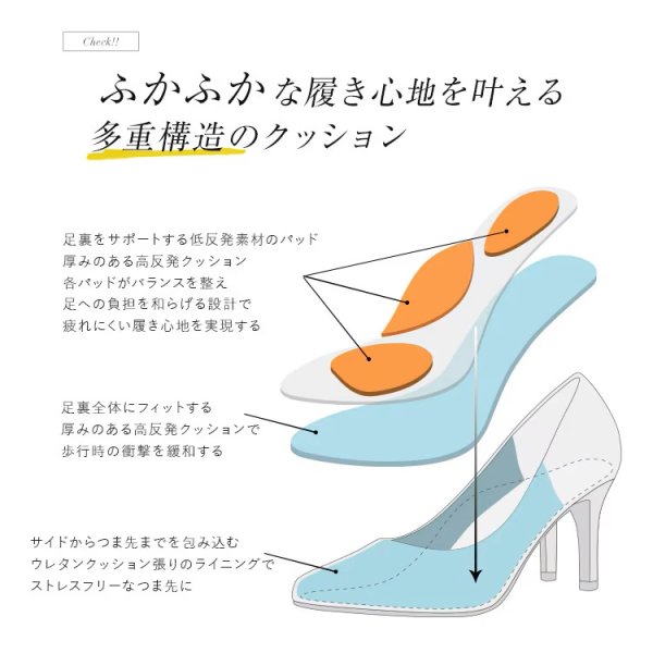 疲れにくく、楽な履き心地を追求したパンプスはヒールを履きなれない方にもオススメです。