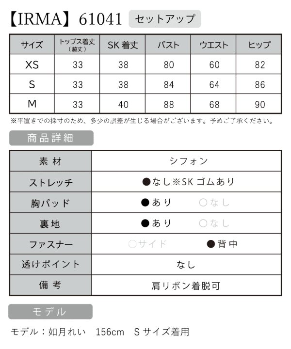B:84 / W:64 / H:86 着丈(トップス)脇下約33cm (スカート)約38cm |