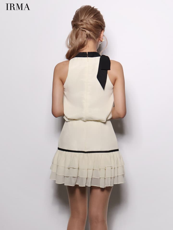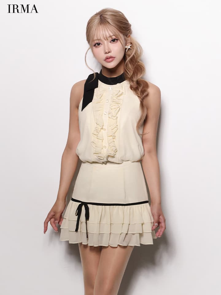 【予約商品/2月下旬発送予定】XSサイズあり【IRMA/イルマ】フリル/ ハイネック/ バイカラー/ リボン/ ノースリーブ/ フレア/ セットアップ/ ミニドレス/ キャバドレス[OF2A] [61041-IR-vanilla-2602]