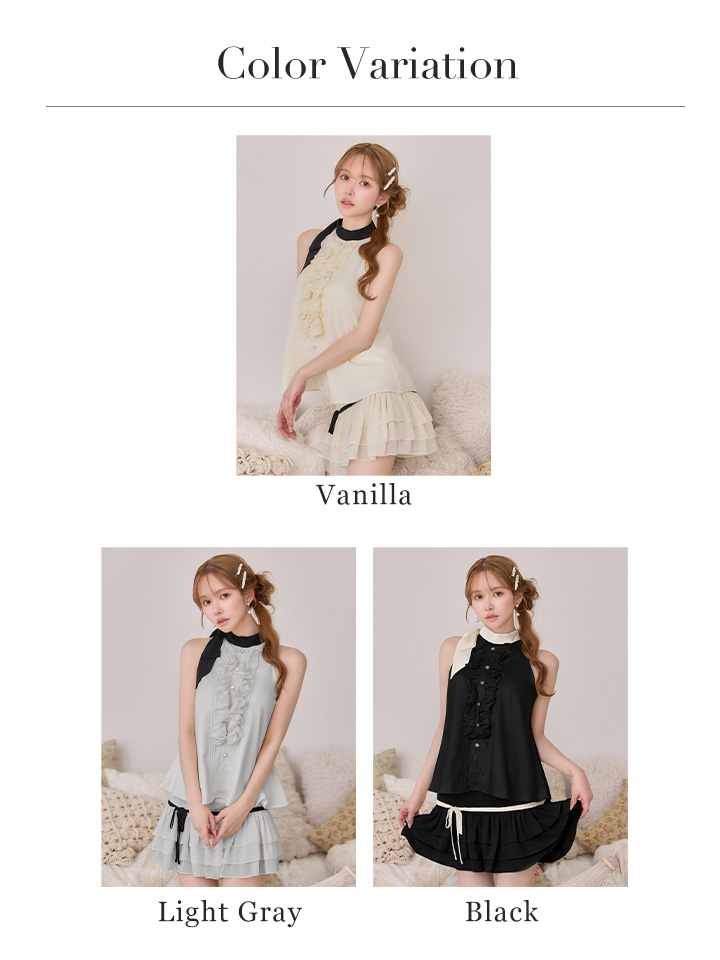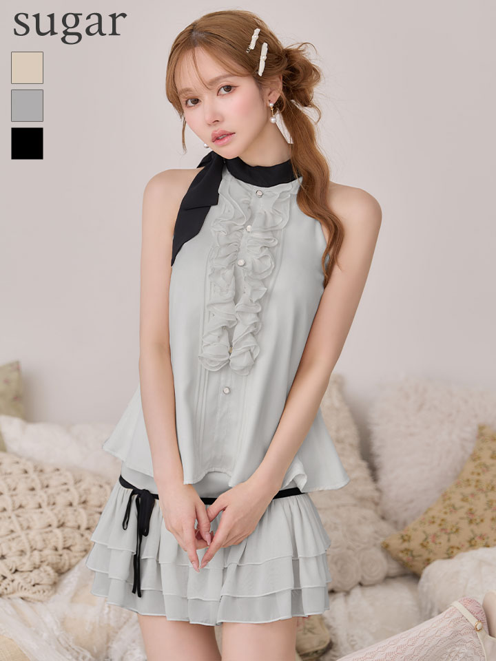 【予約商品/2月下旬発送予定】XSサイズあり【IRMA/イルマ】フリル/ ハイネック/ バイカラー/ リボン/ ノースリーブ/ フレア/ セットアップ/ ミニドレス/ キャバドレス[OF2A] [61041-IR-vanilla-S260224]