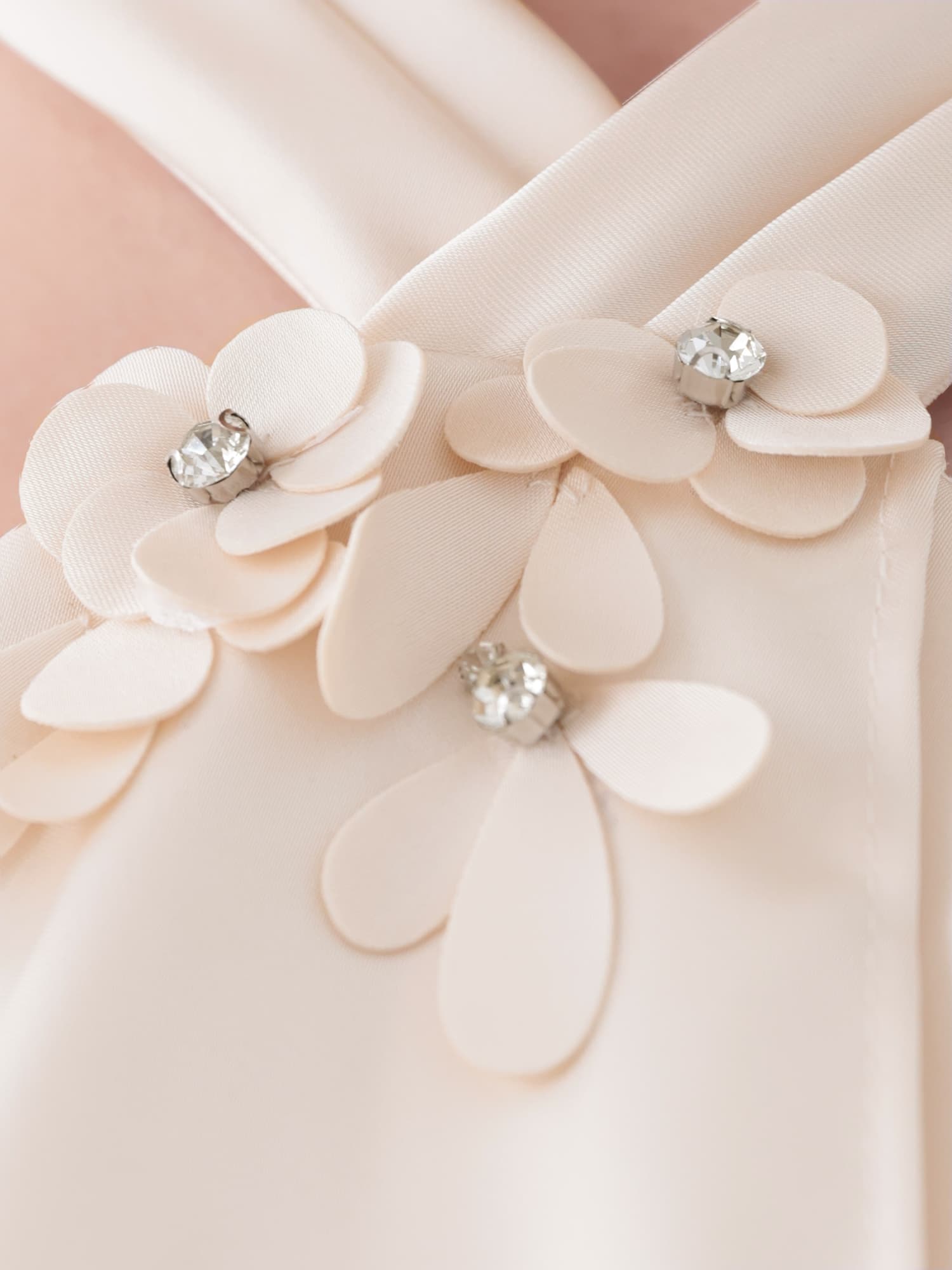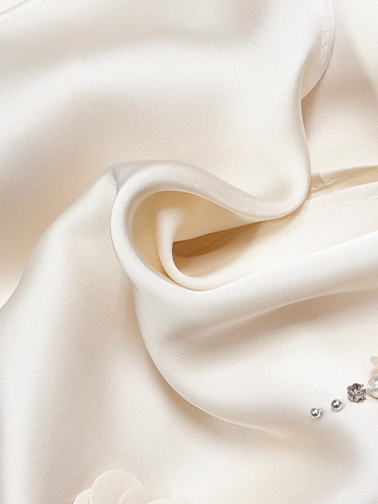 軽やかなシフォン素材に立体フラワーモチーフをあしらった、存在感のあるセットアップデザイン。