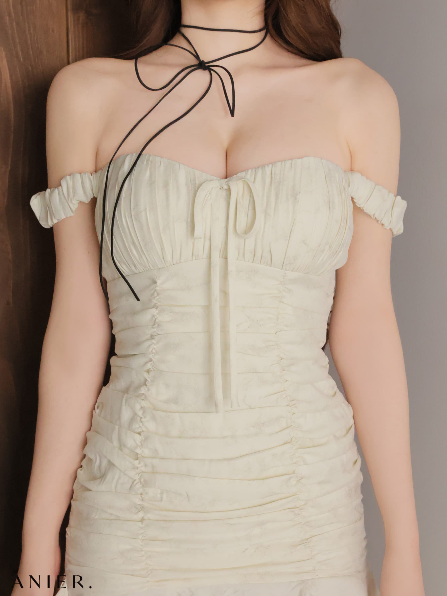 【予約商品/2月下旬発送予定】XSサイズあり【ANIER./アニエル】【ROBE de FLEURS/ローブドフルール】haze offshoulder mini dress/ フリル/ ツイル/ オフショルダー/ ミニドレス/ キャバドレス[OF08] [ANIER4062-IVGY-S260224]